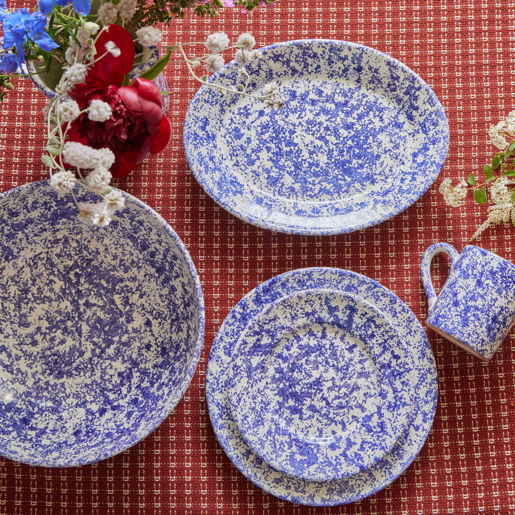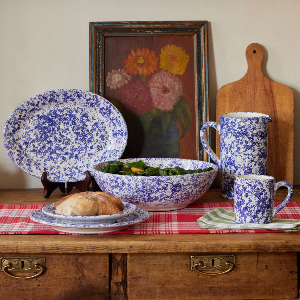 Introducing our new line of ceramic spongeware, The Gable Collection. Handmade in Vietri sul Mare, Italy and inspired by the classic American stoneware designs of the 20th century, The Gable Collection is durable enough for everyday use and handsome enough to adorn the walls of a French country house. A staple of country design, the simple sponge printing technique was popularized in the late 19th century, and production was concentrated in places like Zanesville, Ohio and Trenton, New Jersey. The full collection includes dinner and side plates, a salad bowl and serving platter, and a jug and mugs.