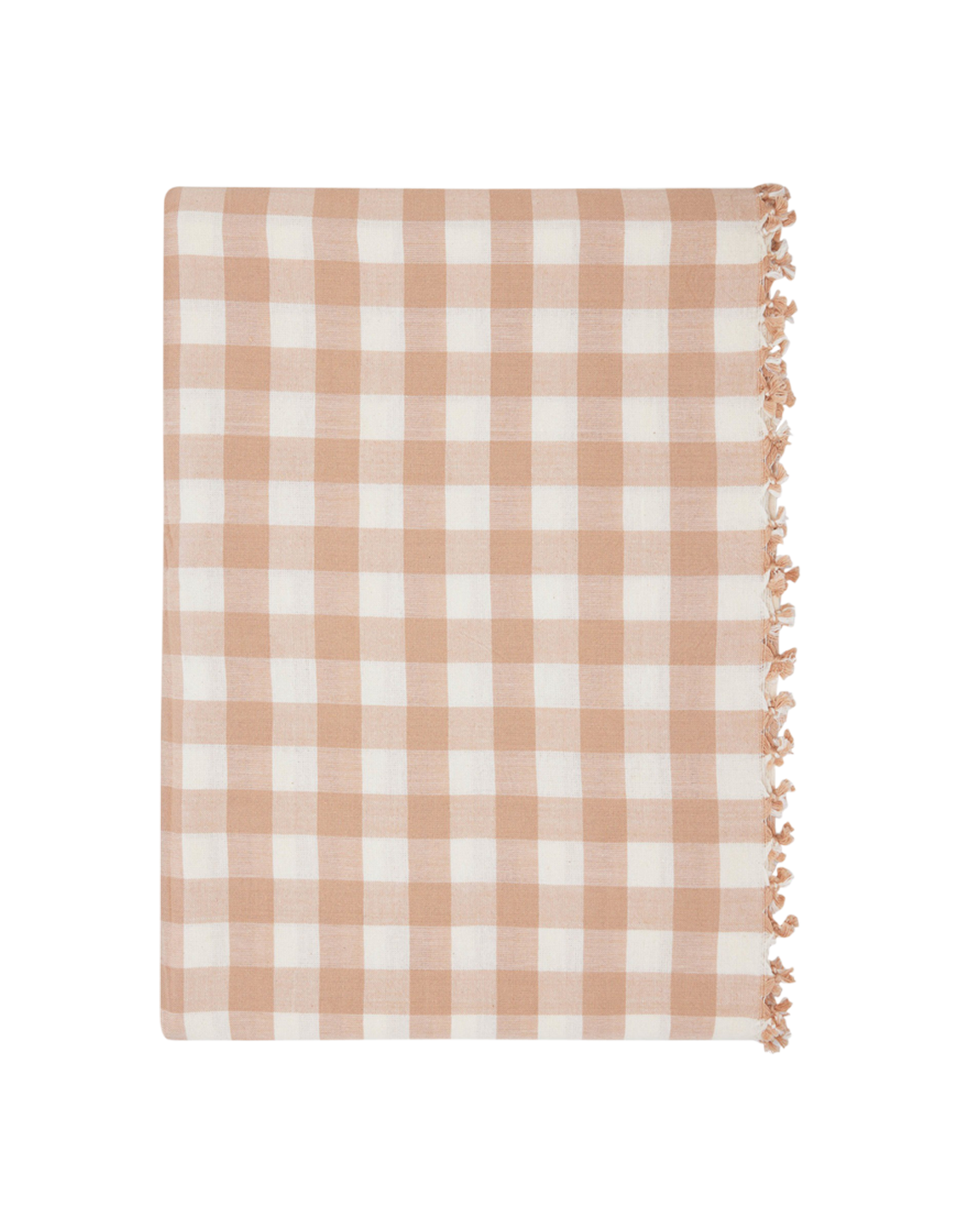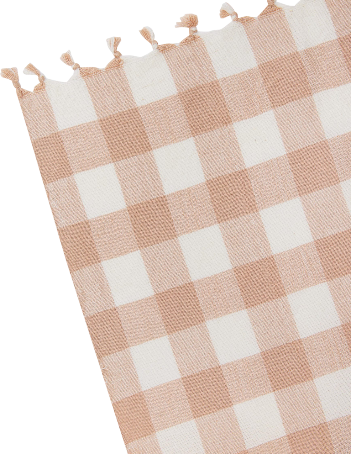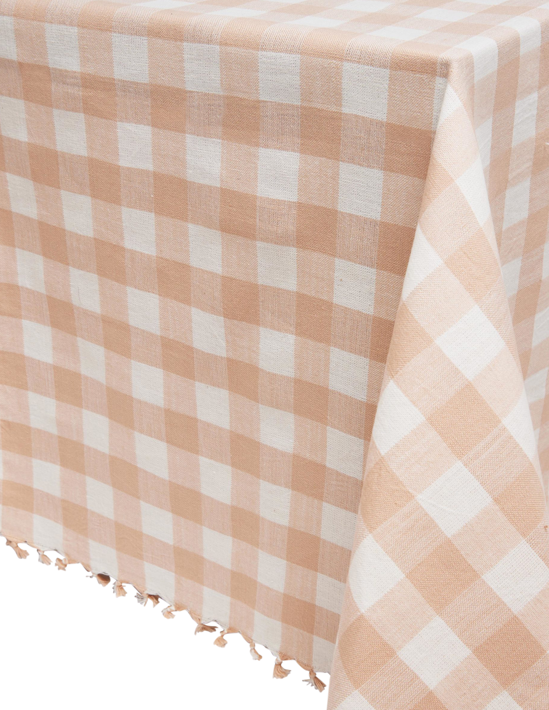 Create a dreamy tablescape with this handwoven tablecloth, available in two sizes. The classic blush gingham print adds rustic charm, while the soft tassels bring a whimsical touch. Crafted from eco-friendly and durable cotton, this tablecloth is perfect for any occasion, from a leisurely outdoor picnic to a cozy indoor dinner party.