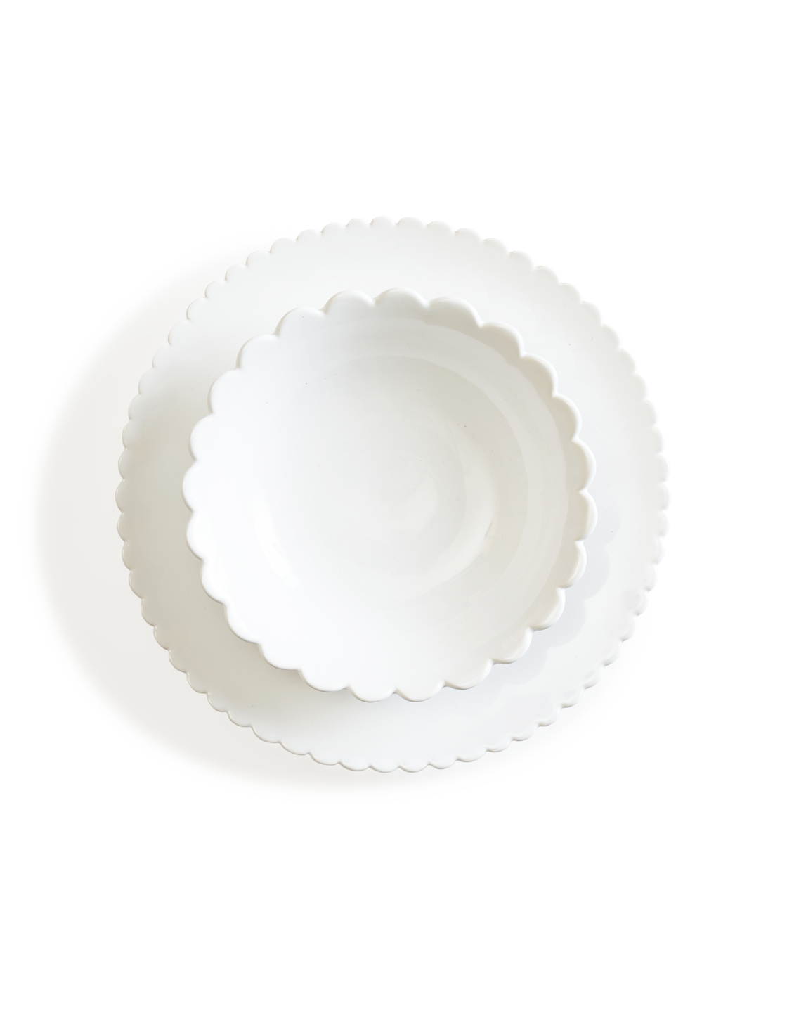 White scalloped dinner plate uniquely handcrafted using 18th Century techniques in Malicorne sur Sarthe, France.