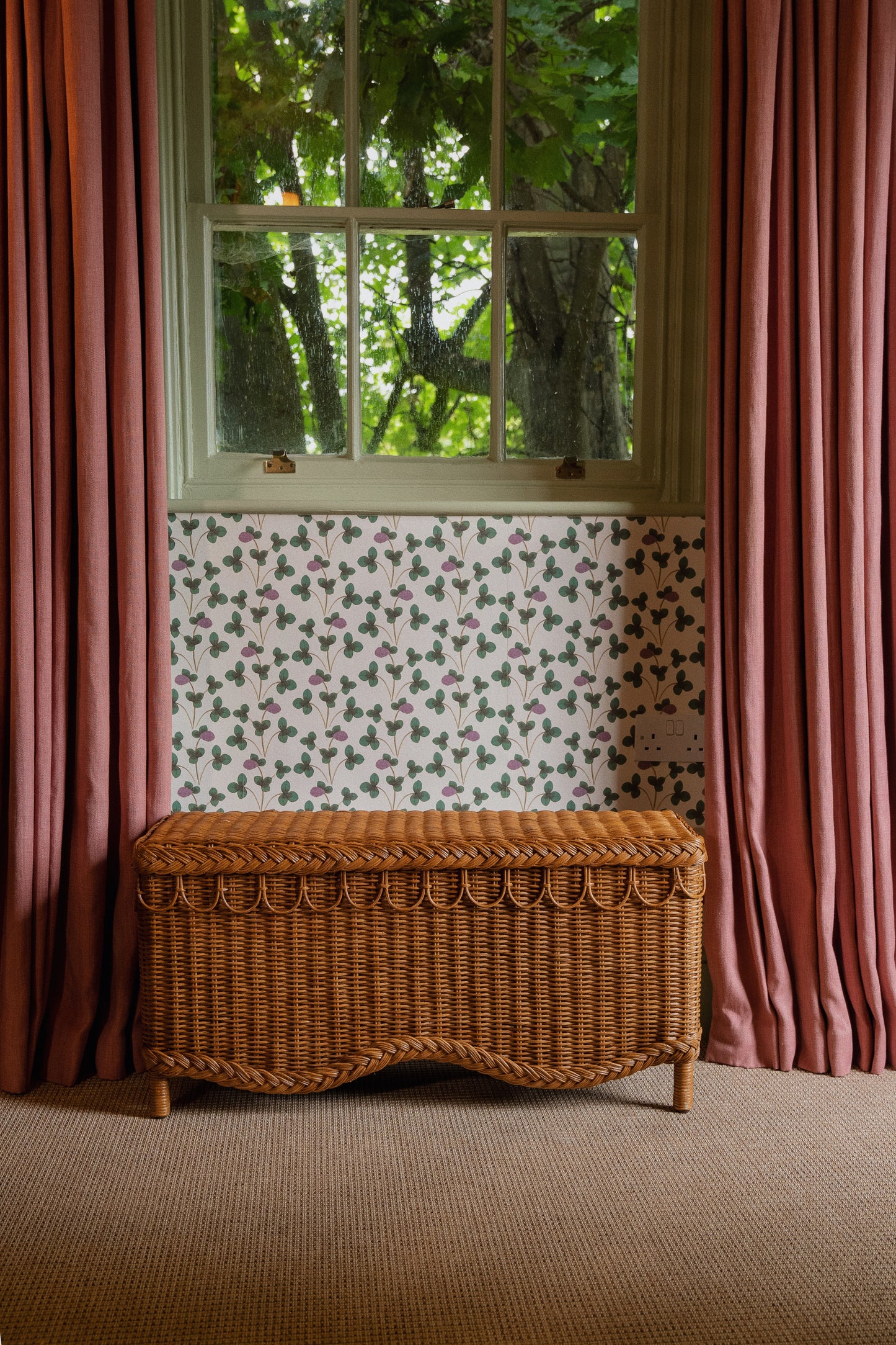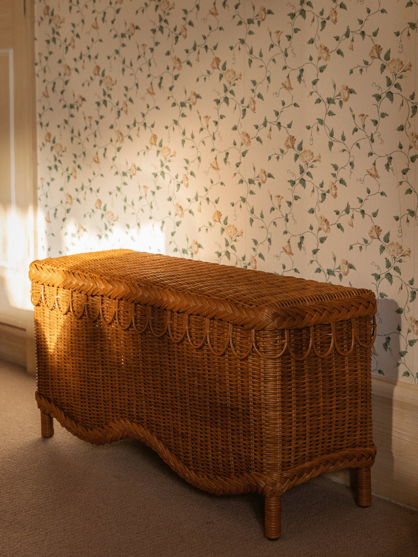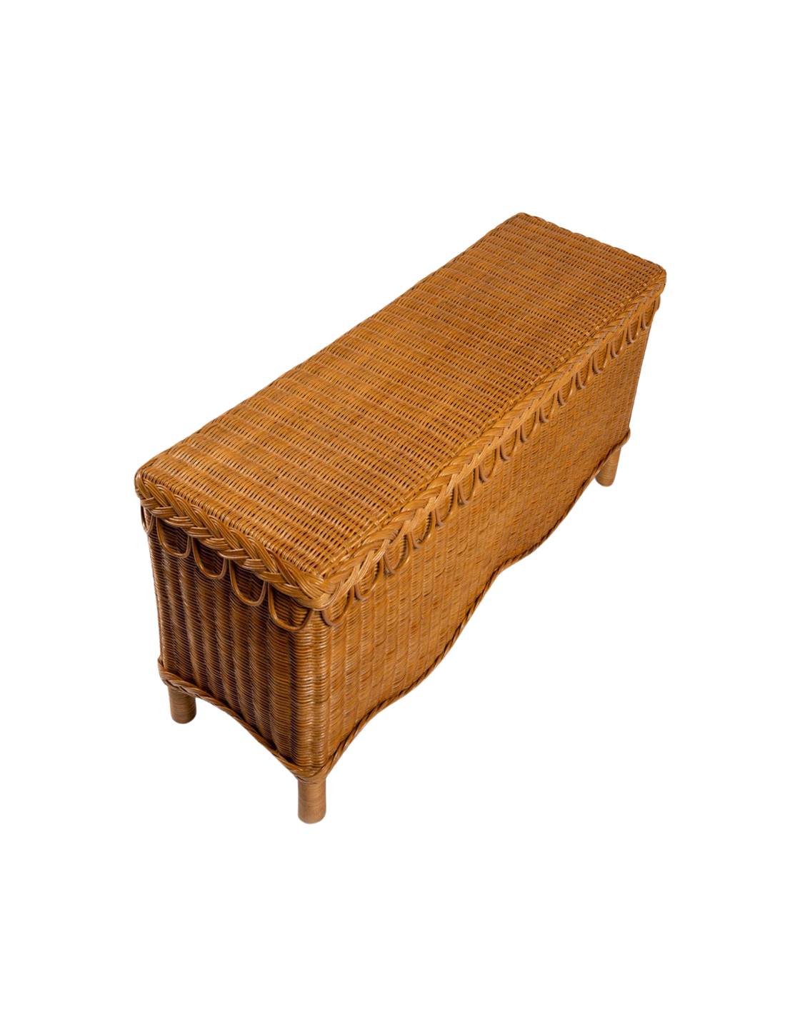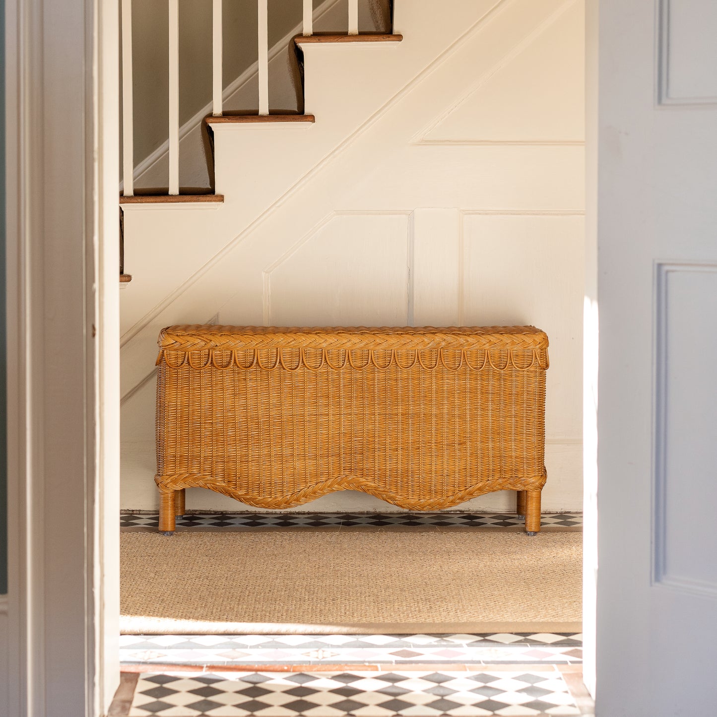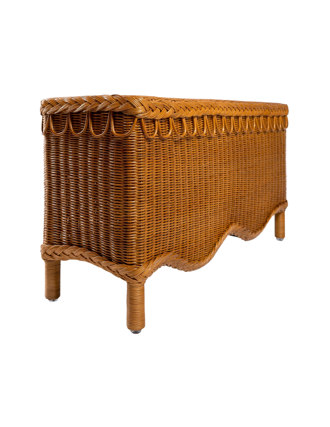 Hand-crafted from 100% natural rattan, the Bunny Bench sits neatly at the foot of a bed, adjacent to the base of stairs, by the front door (perfect for putting on shoes), plus it also looks fabulous as a mini coffee table. Sharland England’s signature braiding and loops run around the rim, and a scalloped hem makes the wicker feel like a beautifully draped tablecloth.