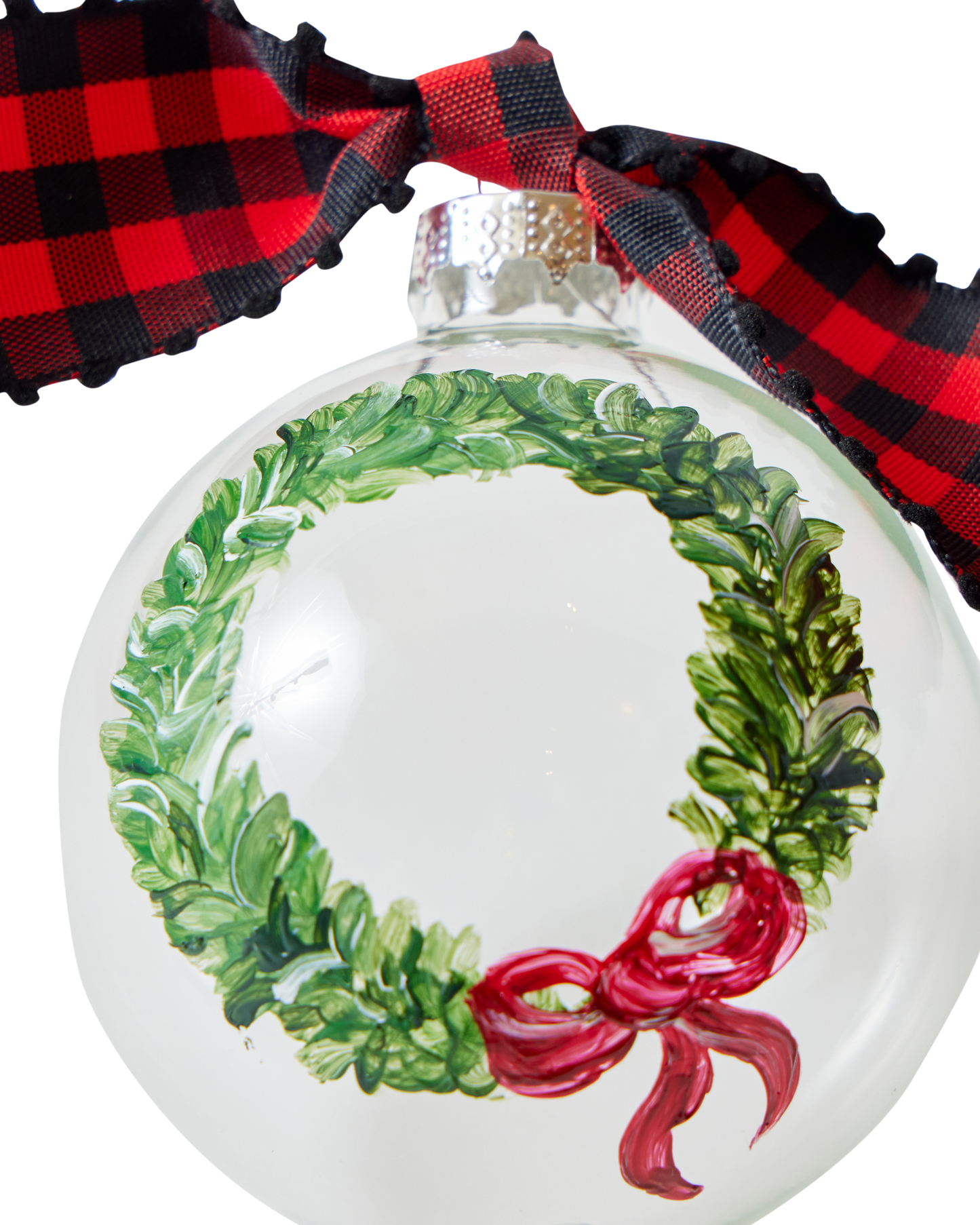 Hand-painted clear glass ornament with Christmas wreaths and a smart red gingham ribbon. Collect with the Painted Topiary ornaments to gift or build a unique set.