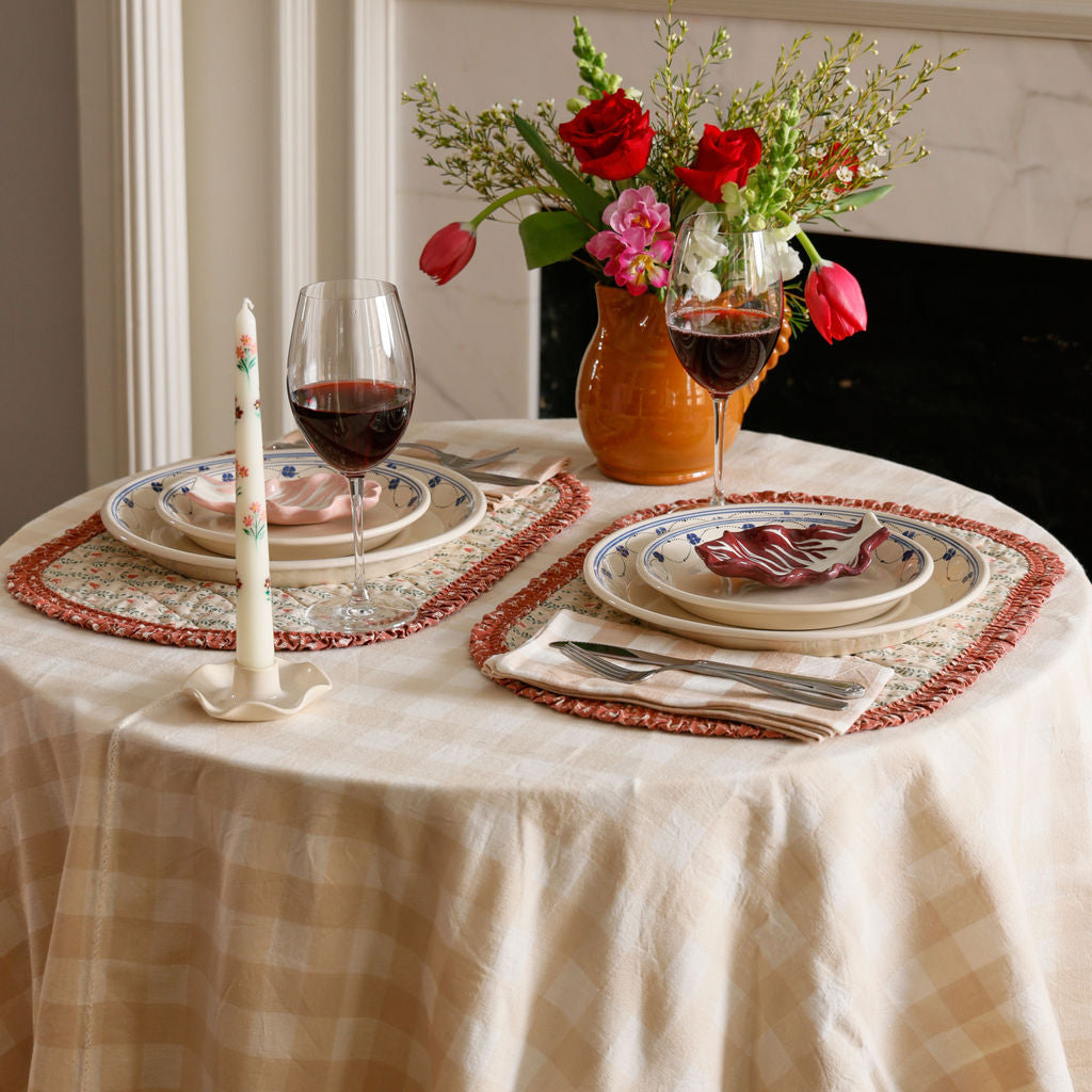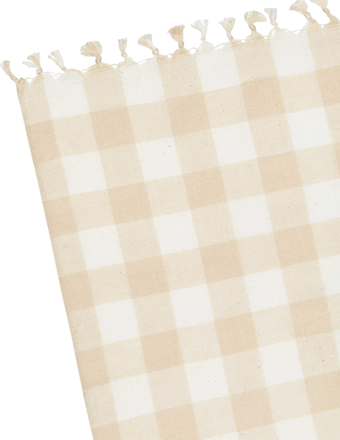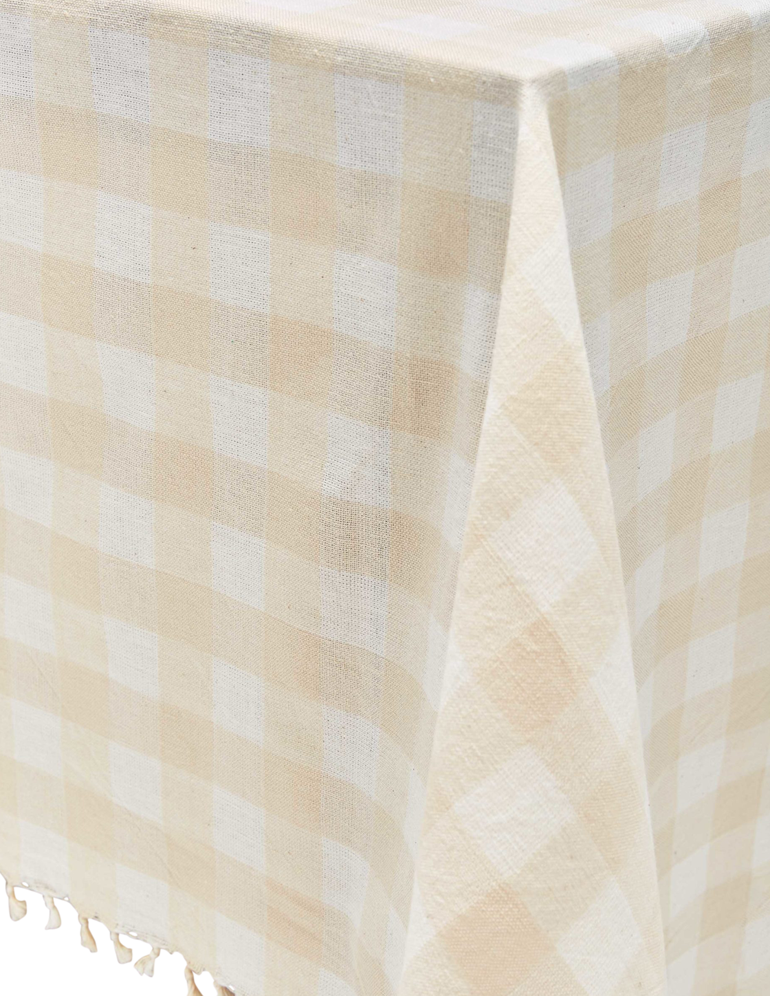Create a dreamy tablescape with this handwoven tablecloth, available in two sizes. The classic cream gingham print adds rustic charm, while the soft tassels bring a whimsical touch. Crafted from eco-friendly and durable cotton, this tablecloth is perfect for any occasion, from a leisurely outdoor picnic to a cozy indoor dinner party.
