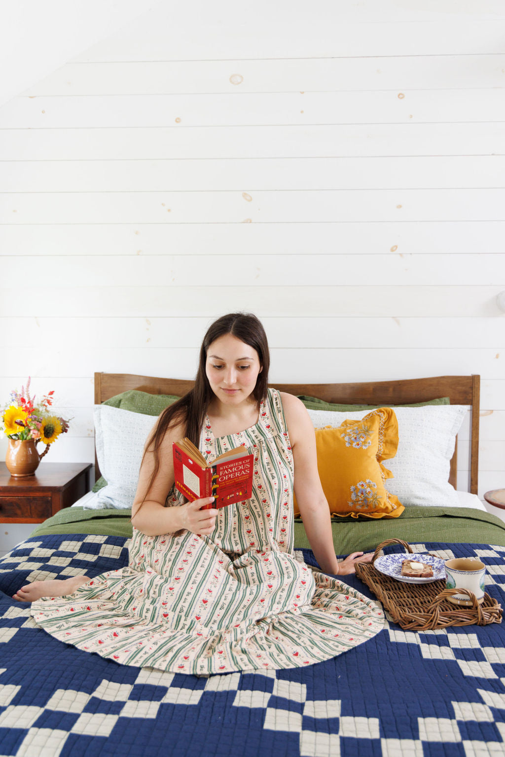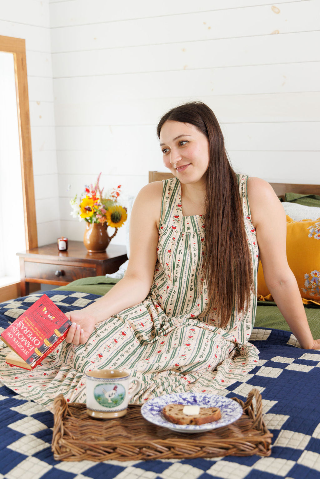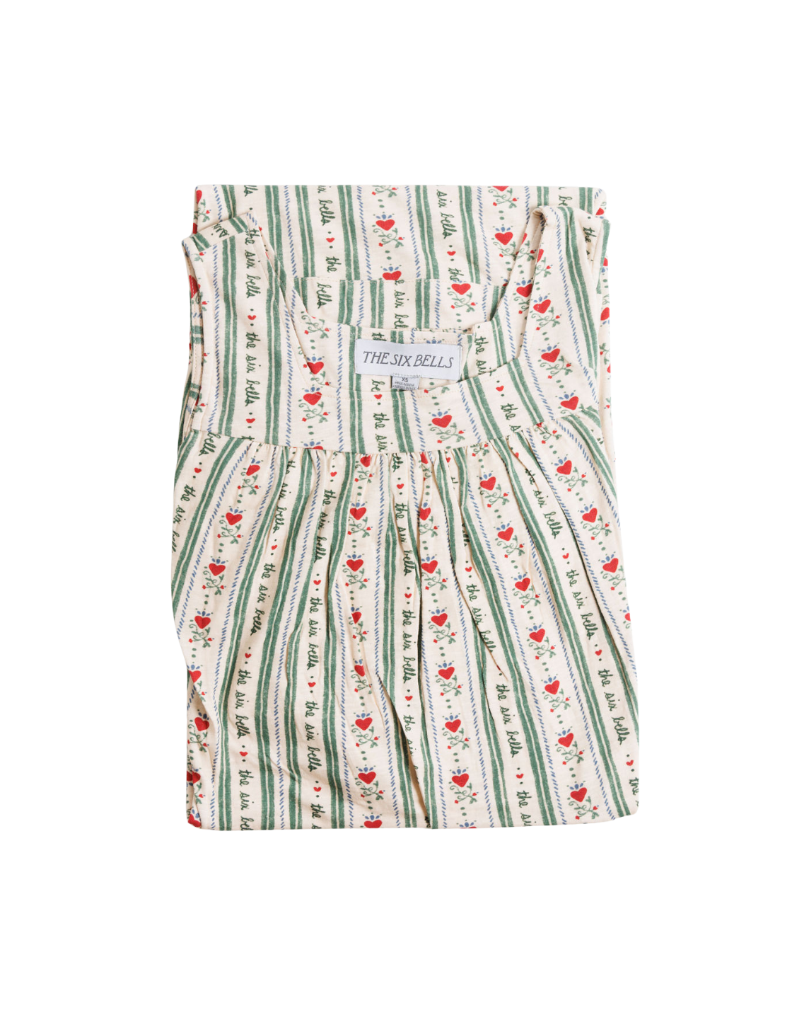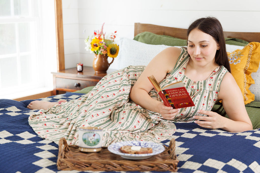 Book covers, vintage wallpaper, and snow covered mountains all inspired this original print, with our hand-drawn Six Bells logo repeating continuously like a vine. Our swingy, sleeveless nightgown is perfect for daytime lounging in bed. Lightly ruched at the neckline and hem for the perfect fit—and a hint of romance.