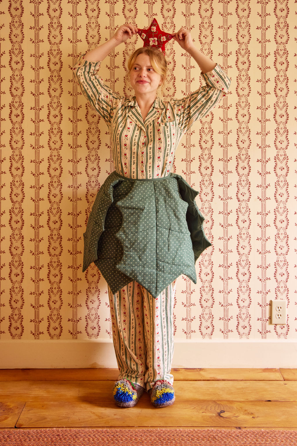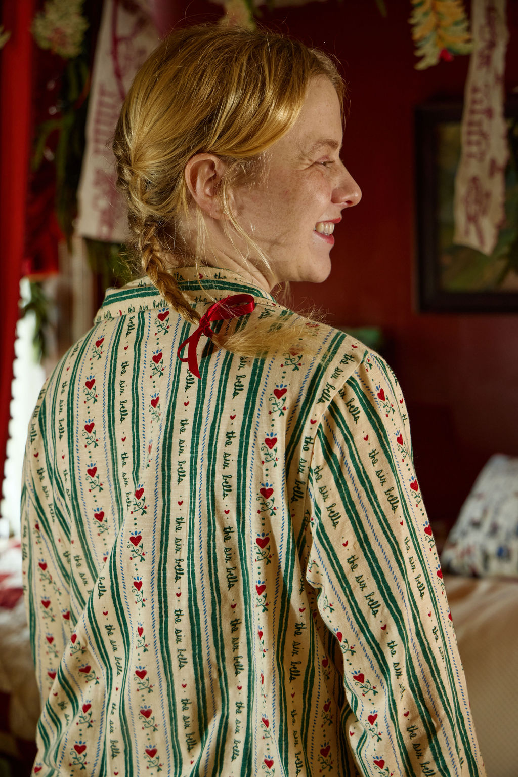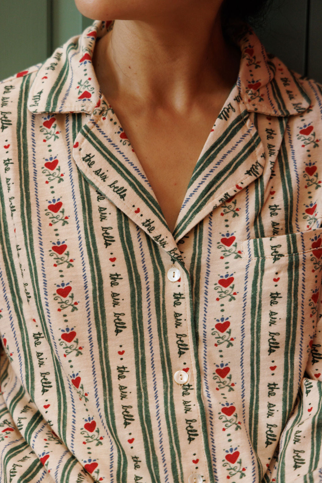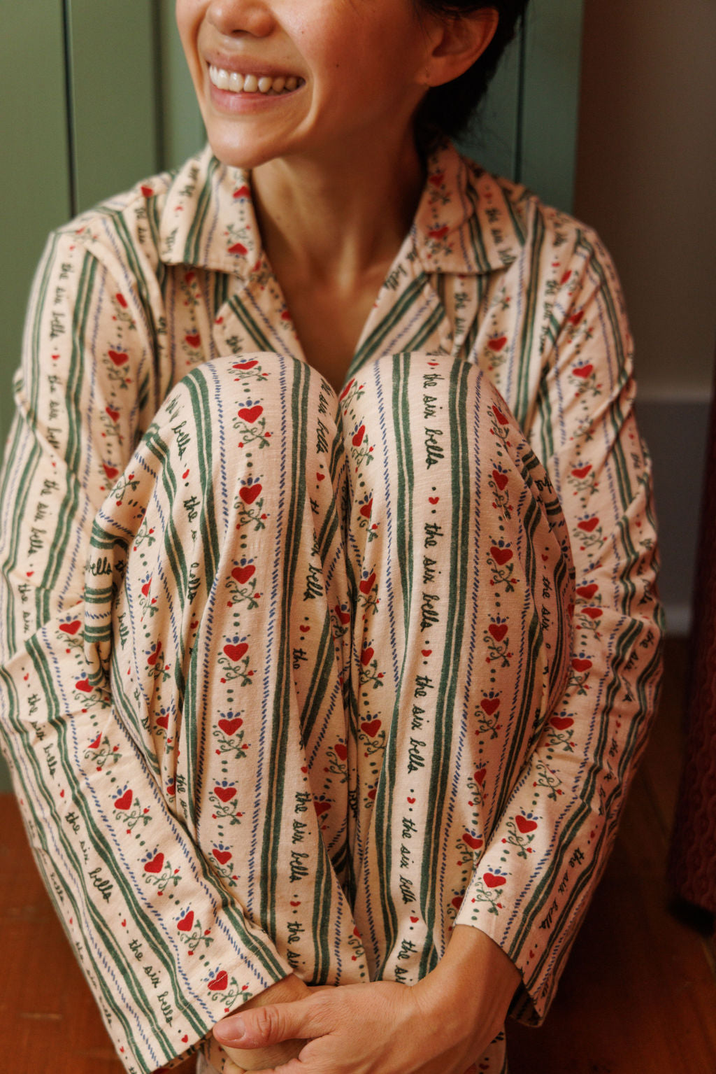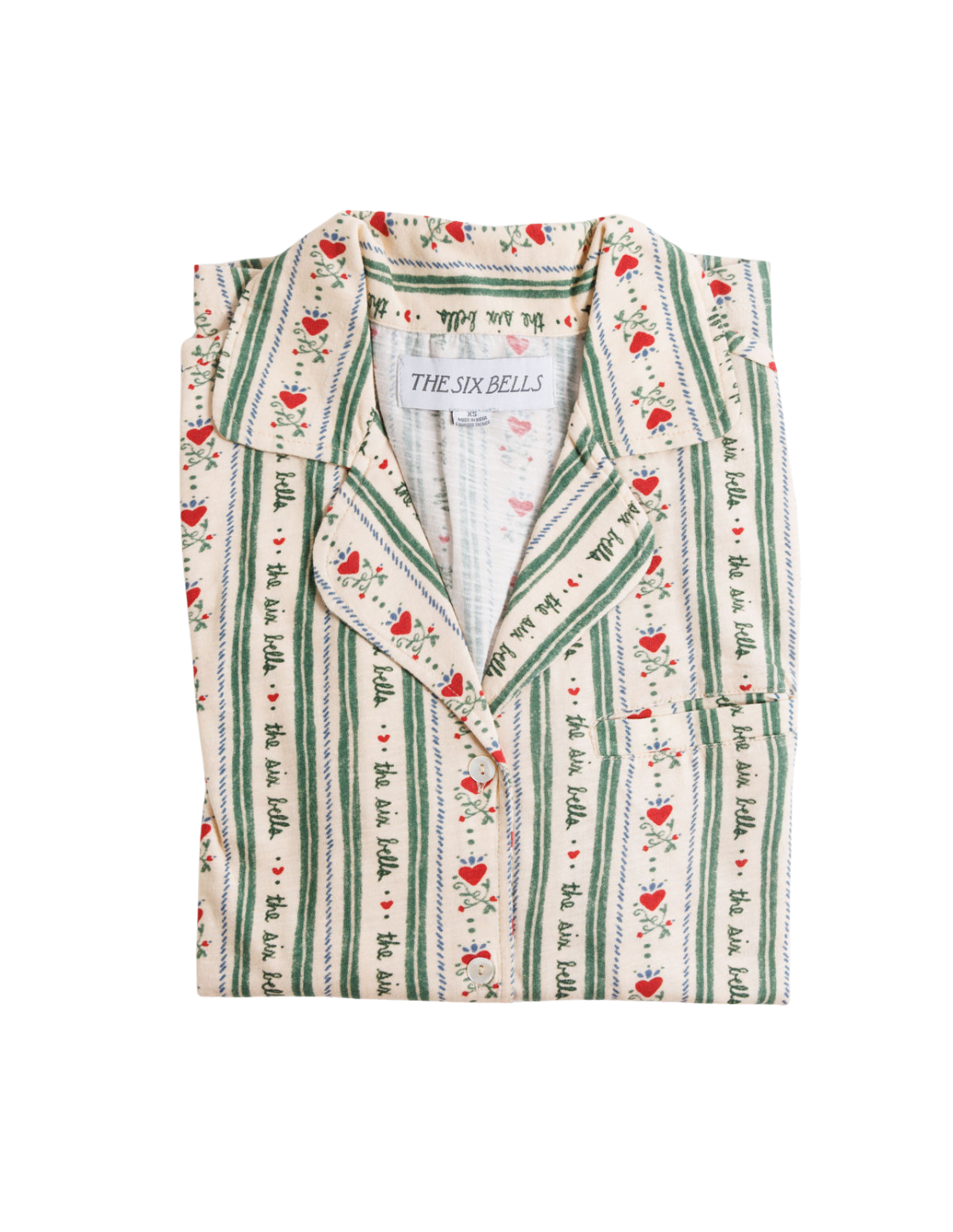 Book covers, vintage wallpaper, and snow covered mountains all inspired this original print, with our hand-drawn Six Bells logo repeating continuously like a vine. This pajama set features three pockets—one on the shirt and two on either side of the drawstring pants—and mother-of-pearl buttons.