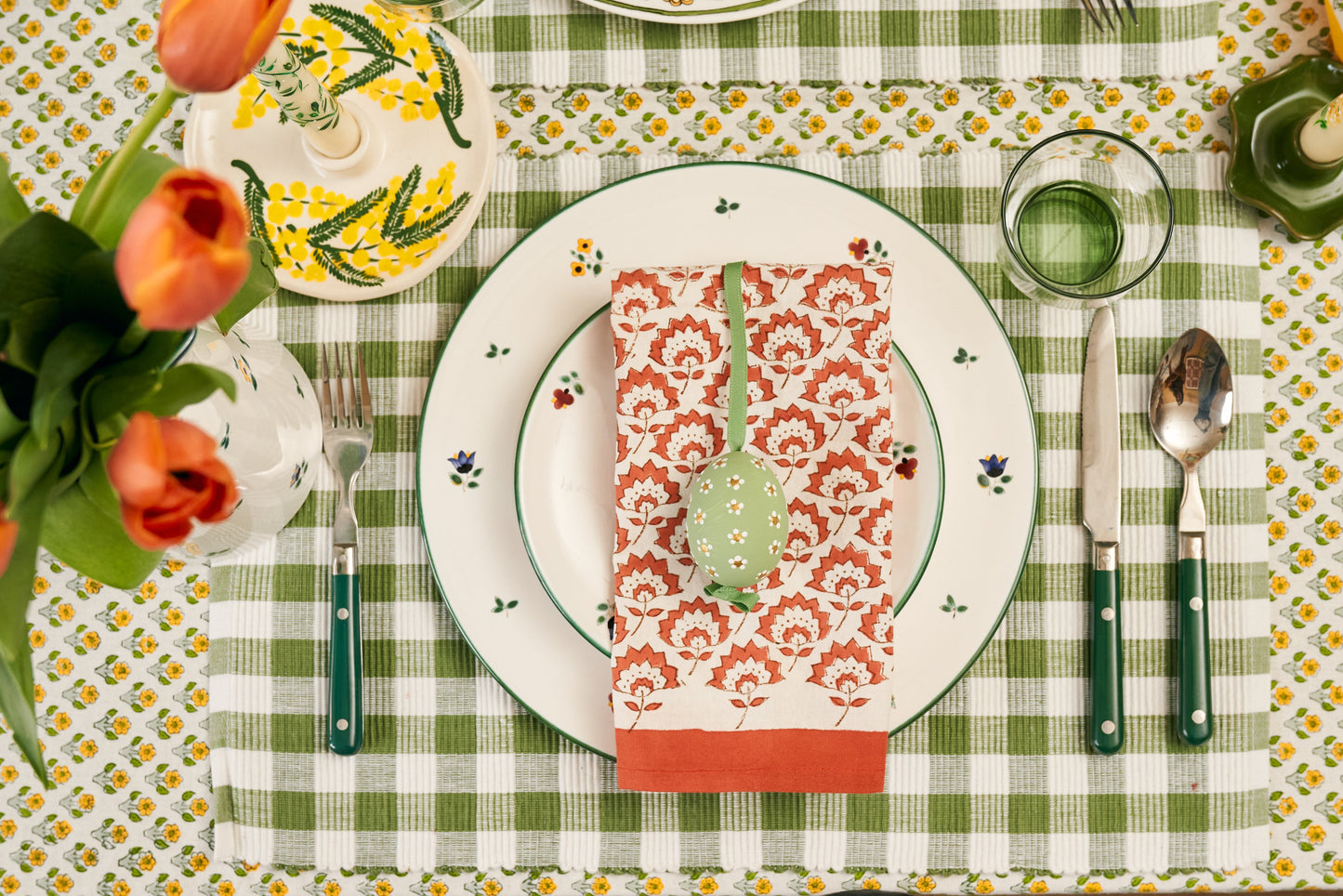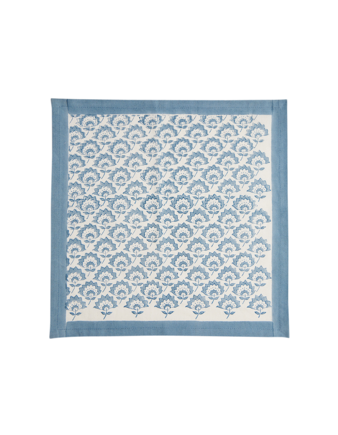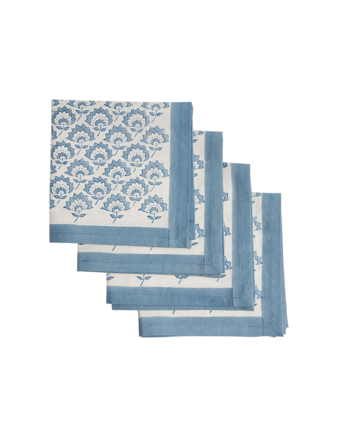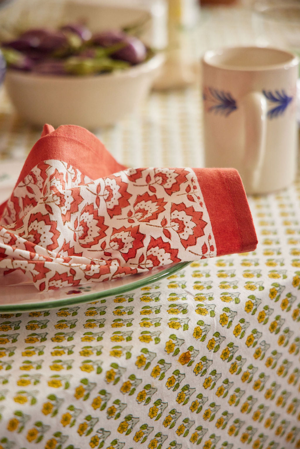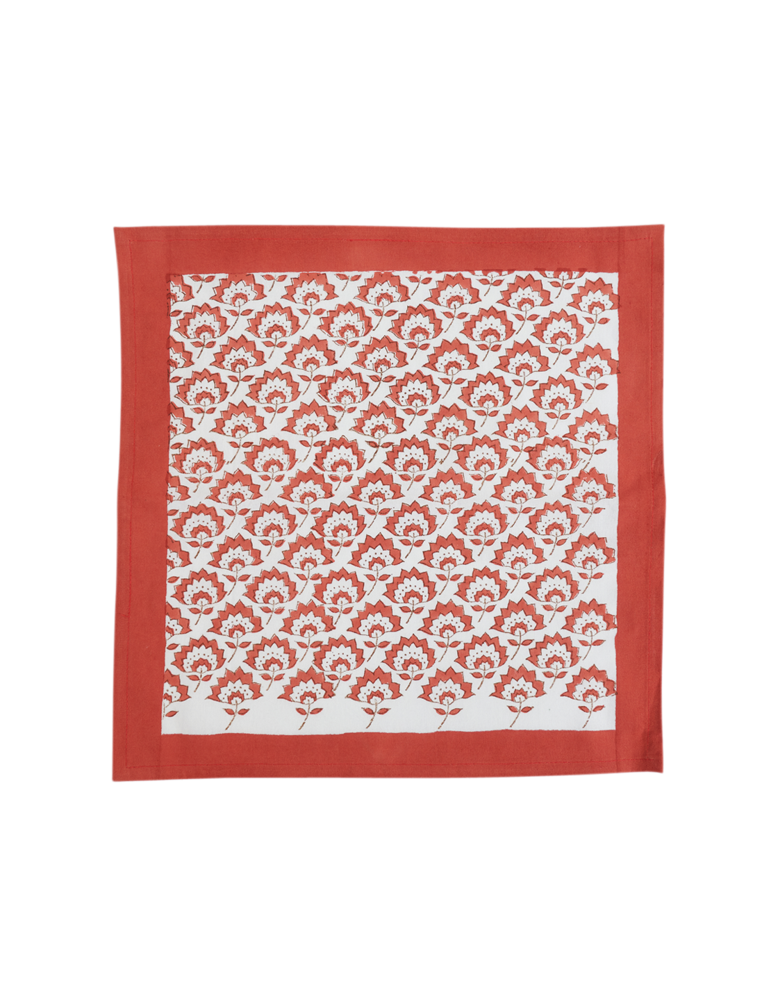 All meals should be extra festive, whether they're a stack of pancakes or a four-course dinner. These floral print napkins are block-printed by hand in India in brick red and cornflower blue. Pair with our matching tablecloths.