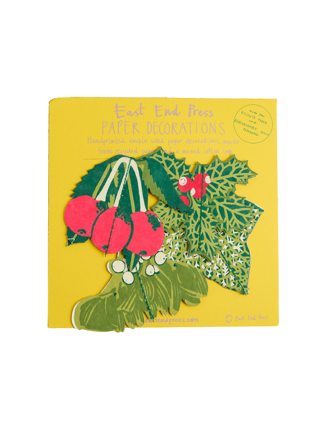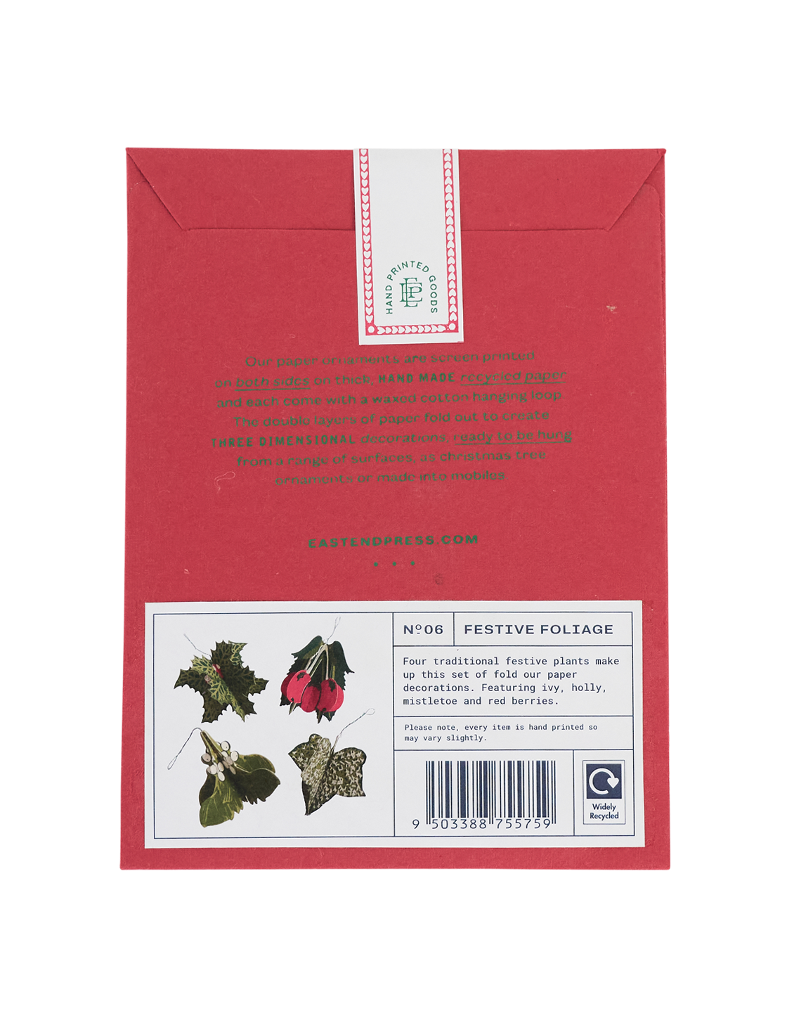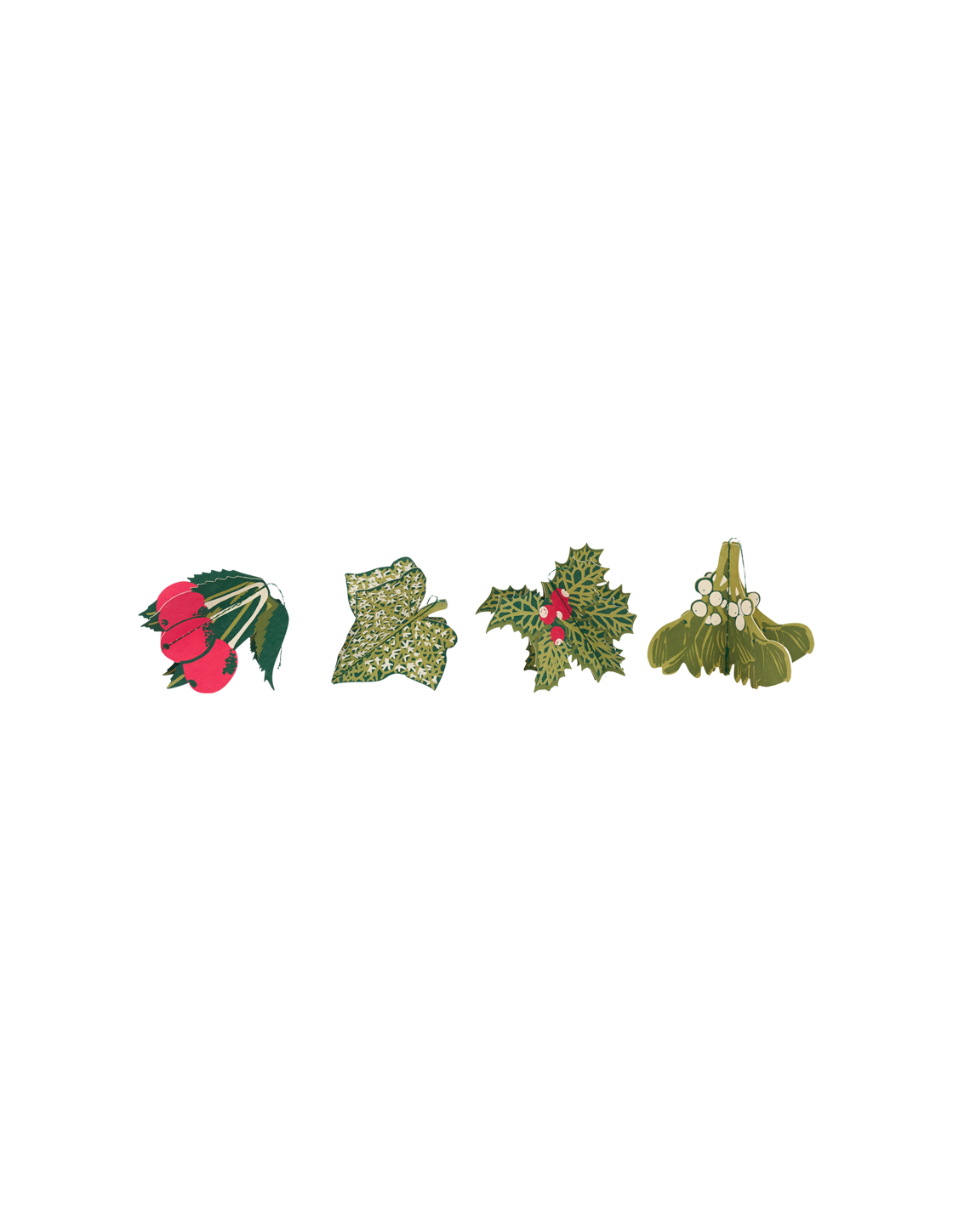 Four traditional festive plants make up this set of fold out paper decorations. Featuring ivy, holly, mistletoe and red berries. Screen printed by hand on both sides by talented artisans in Jaipur.