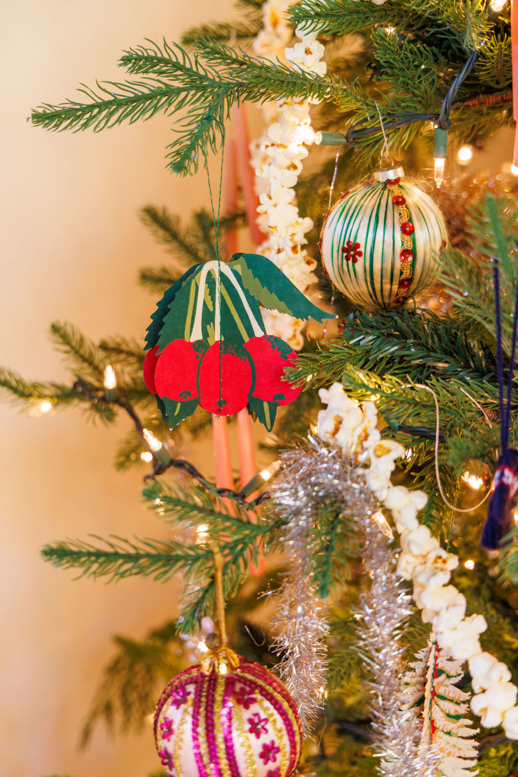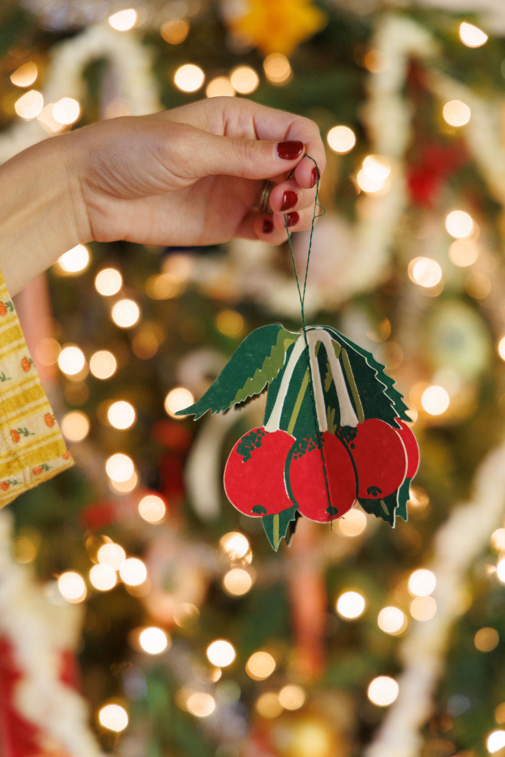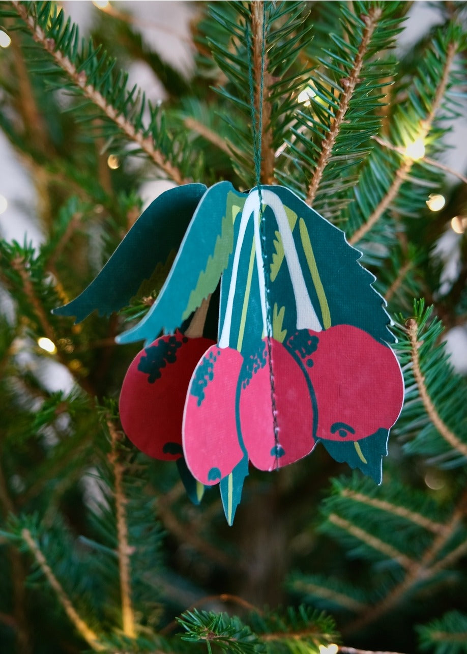 Four traditional festive plants make up this set of fold out paper decorations. Featuring ivy, holly, mistletoe and red berries. Screen printed by hand on both sides by talented artisans in Jaipur.