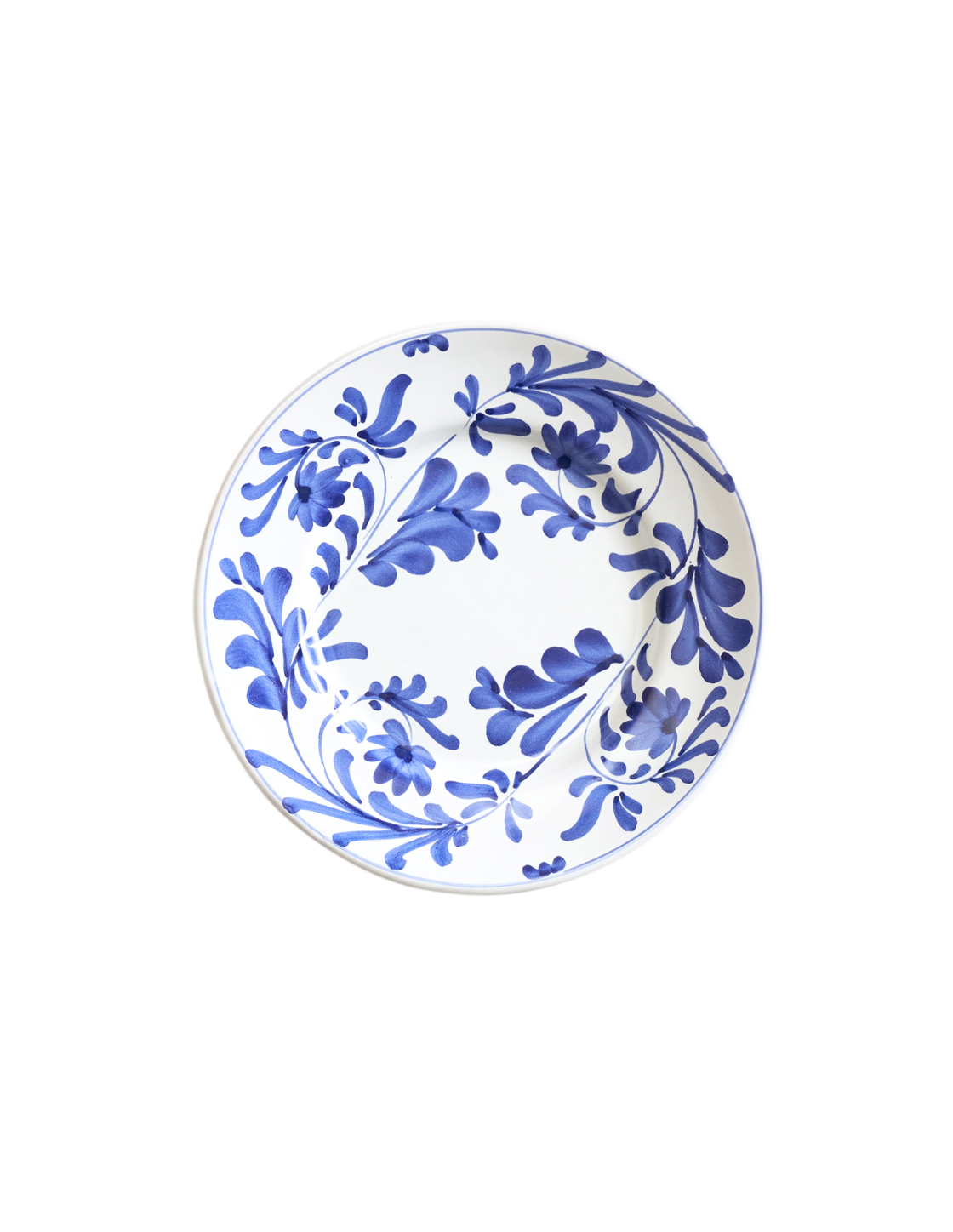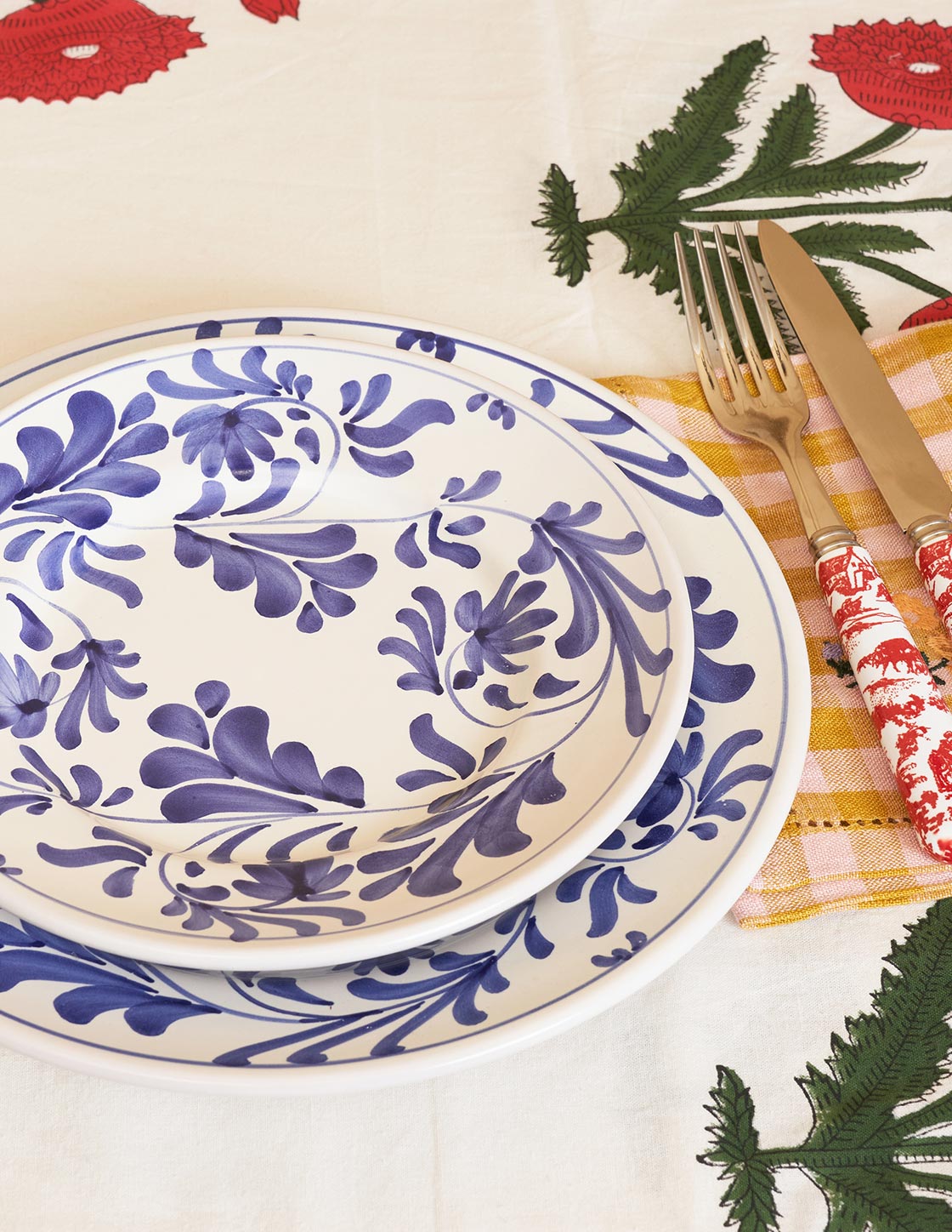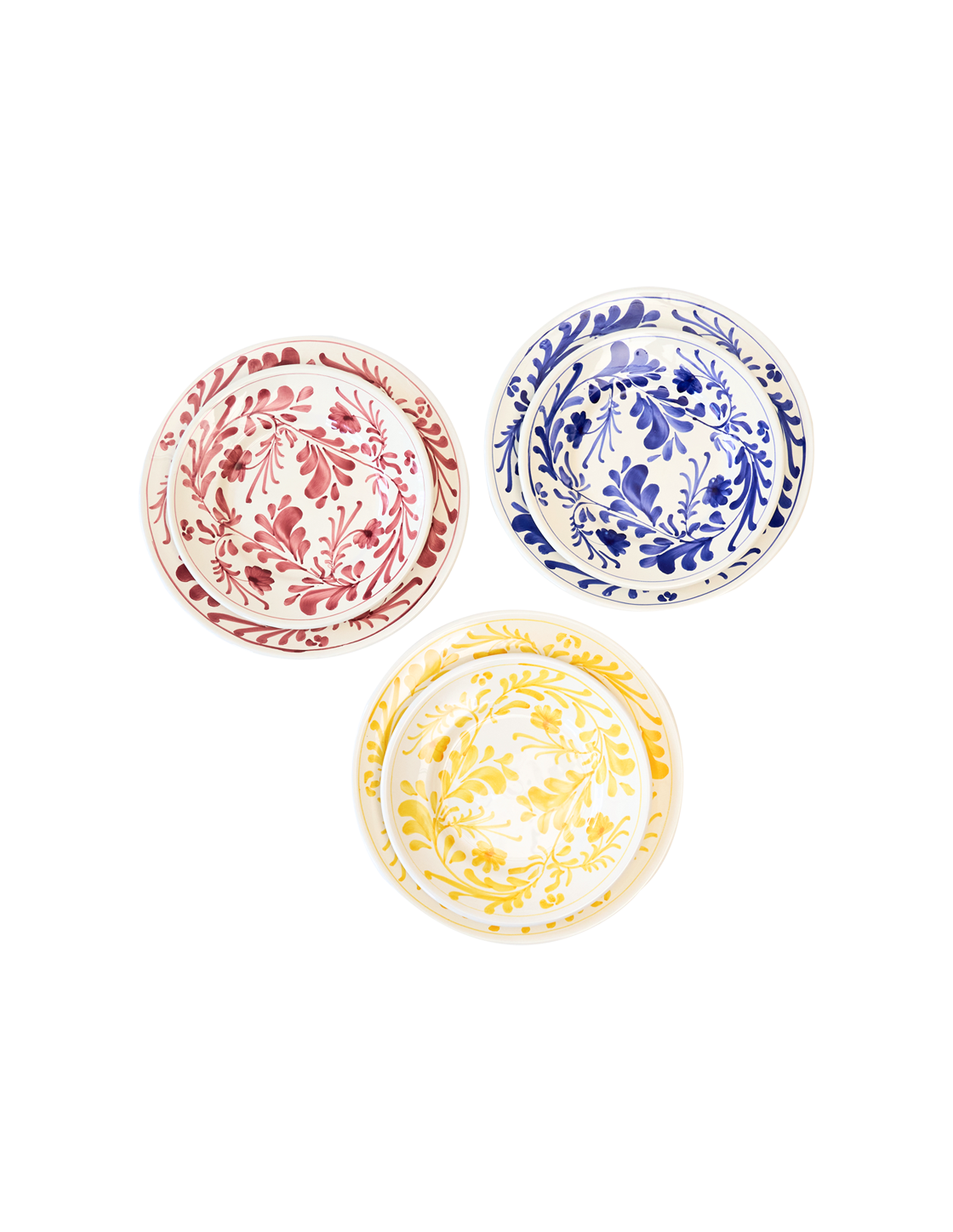 White ceramic side plate hand-painted with a floral pattern - available in blue, yellow, and red. Start your collection of fleurie tableware and watch your hosting skills blossom.