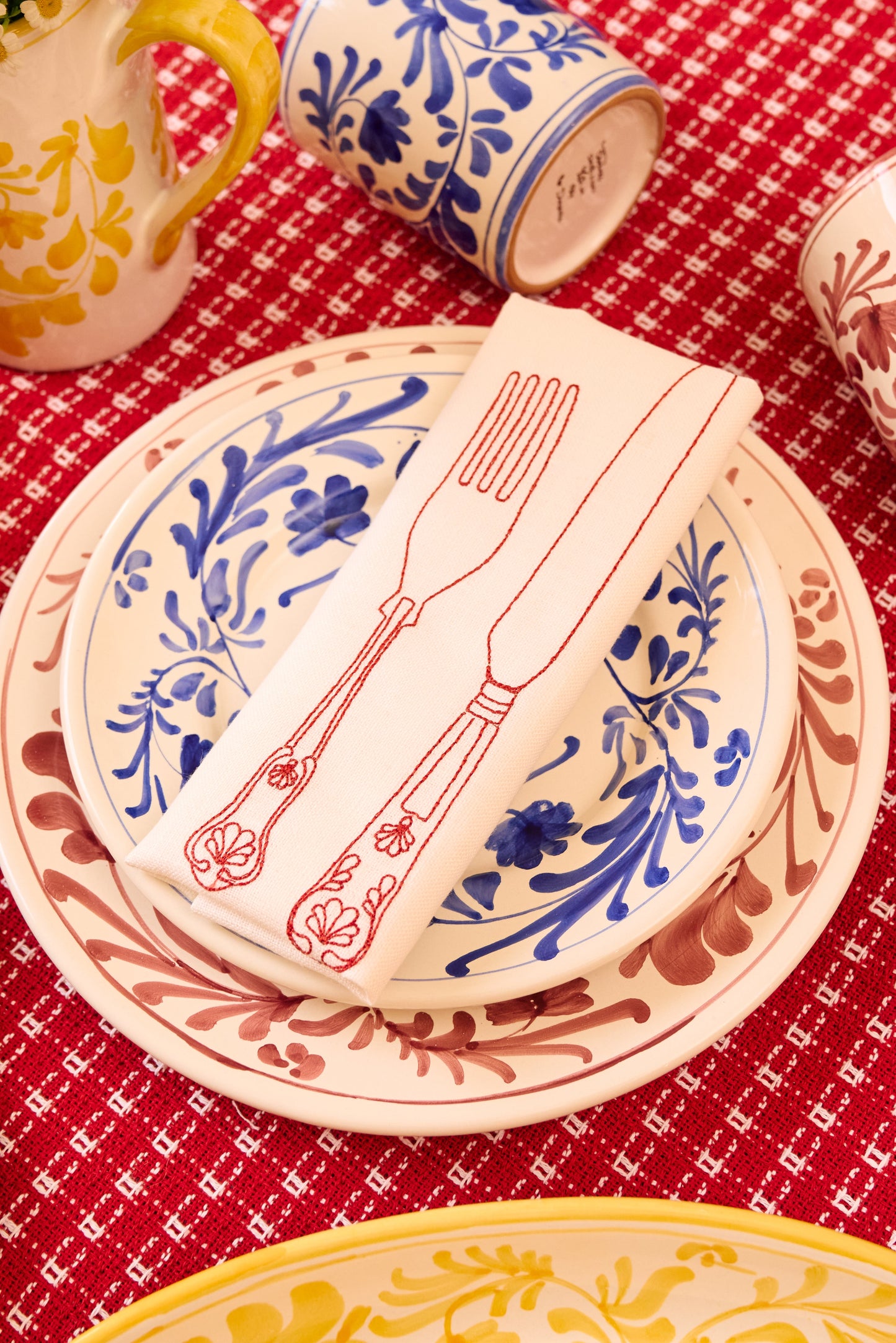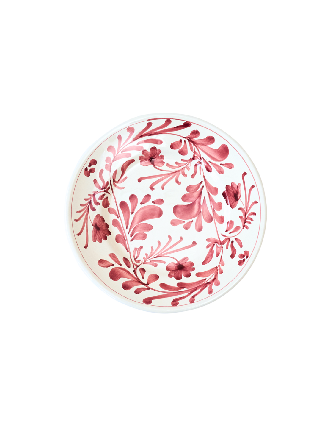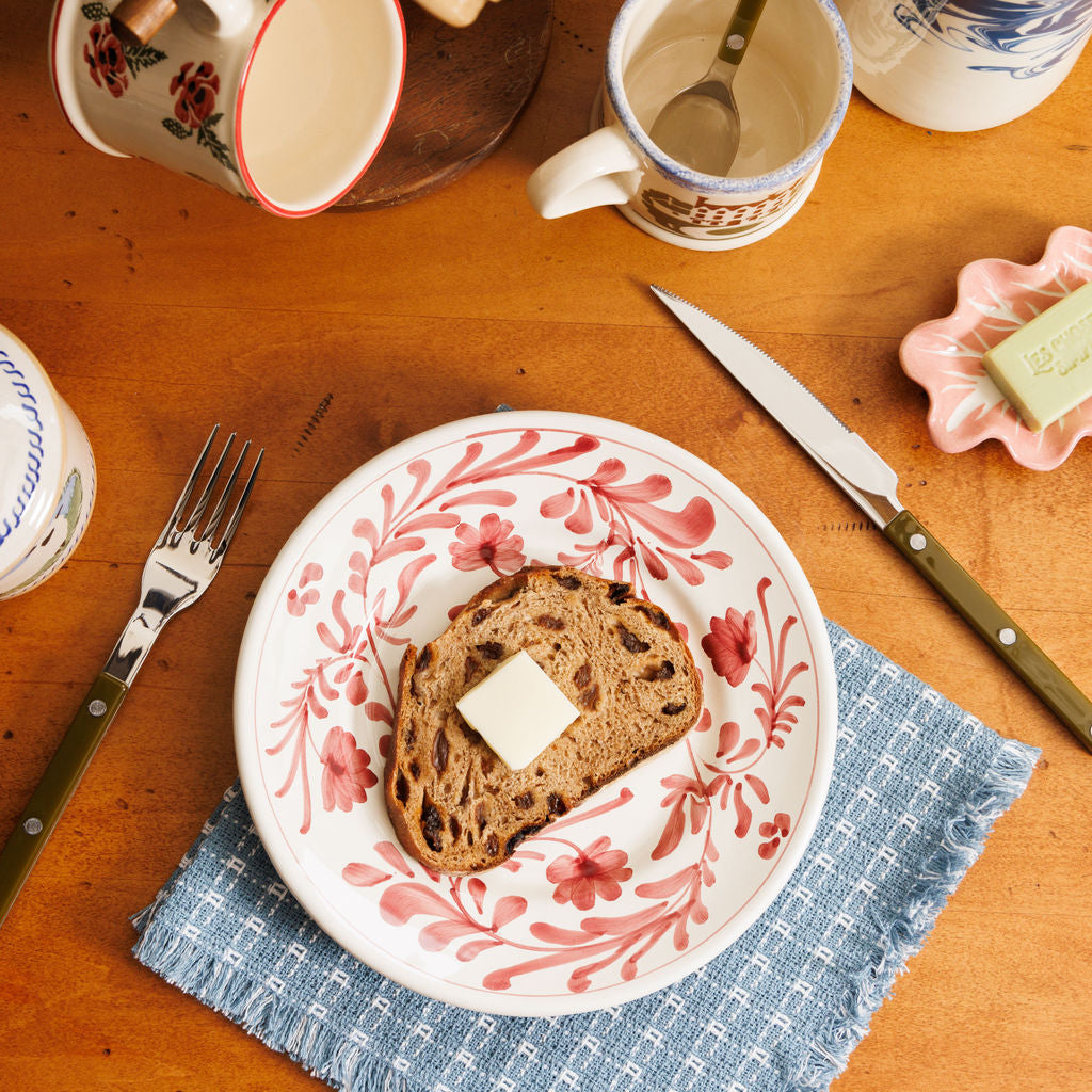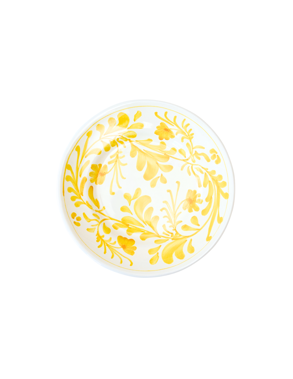White ceramic side plate hand-painted with a floral pattern - available in blue, yellow, and red. Start your collection of fleurie tableware and watch your hosting skills blossom.