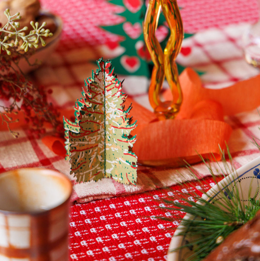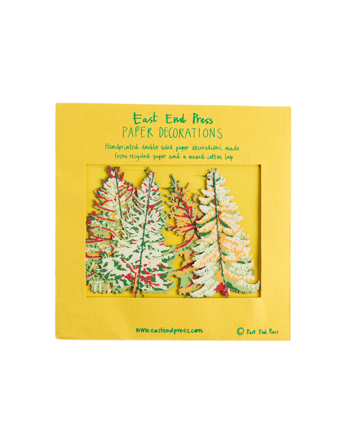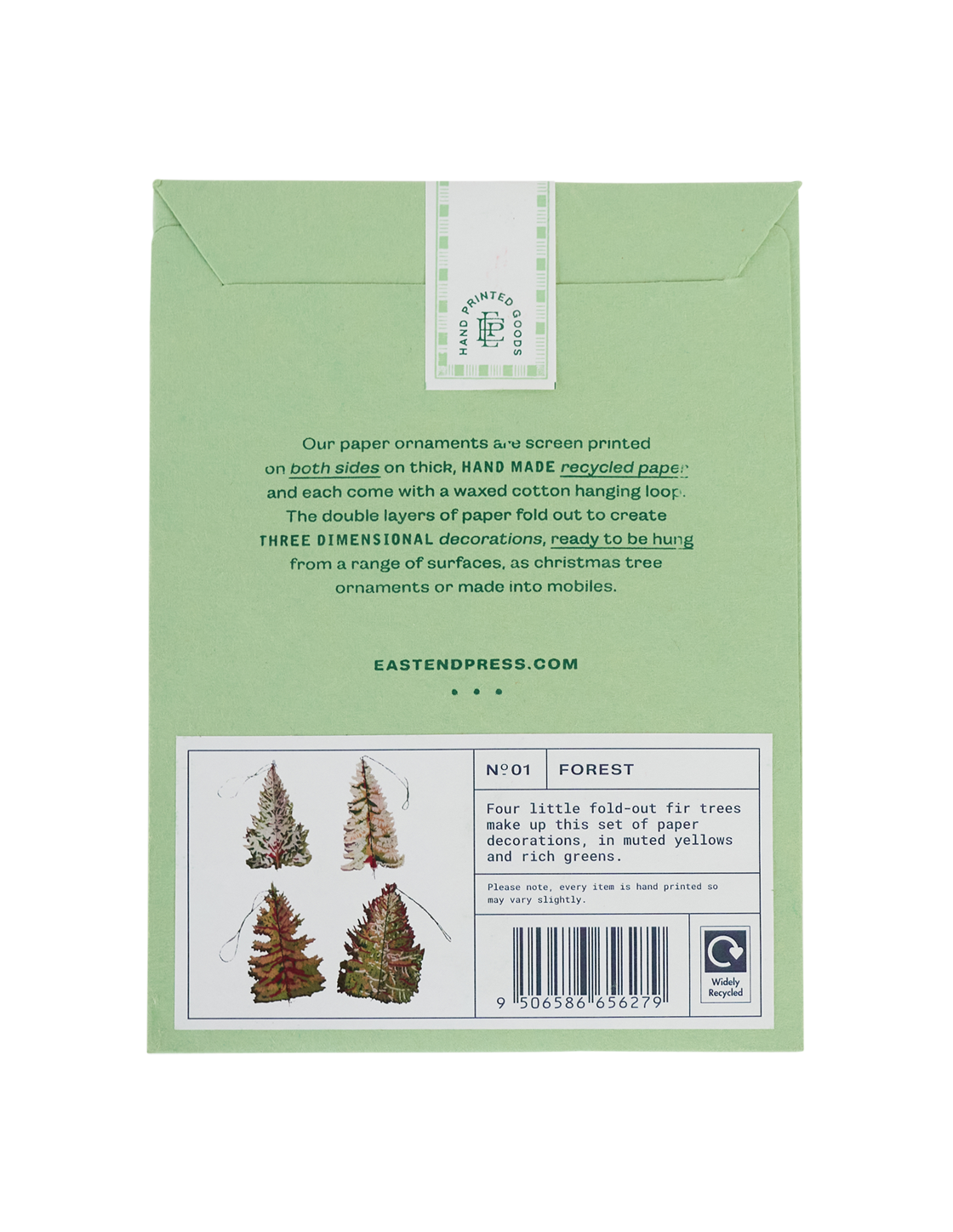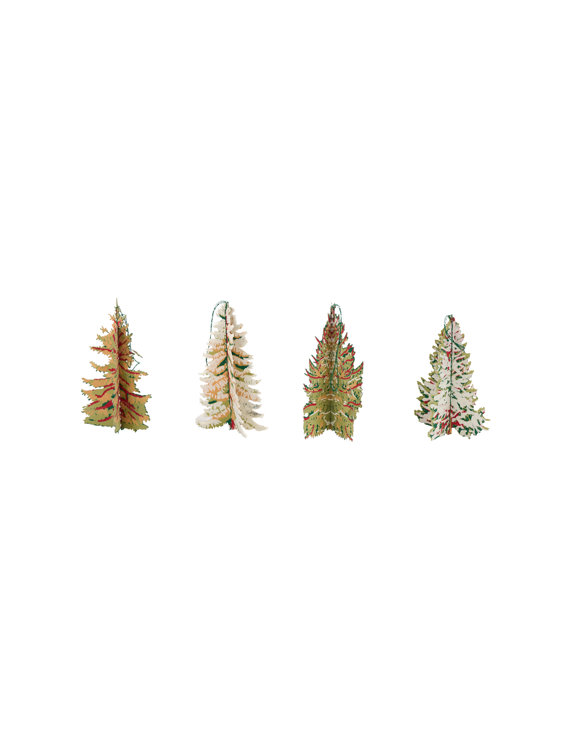 Four little fold-out fir trees make up this set of paper decorations, in muted yellows and rich greens. Each tree has a different design, and folds out to create a three dimensional shape. Complete with a cotton loop, ready to hang! Screen printed by hand on both sides by talented artisans in Jaipur.