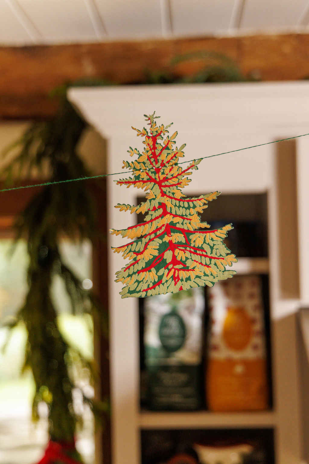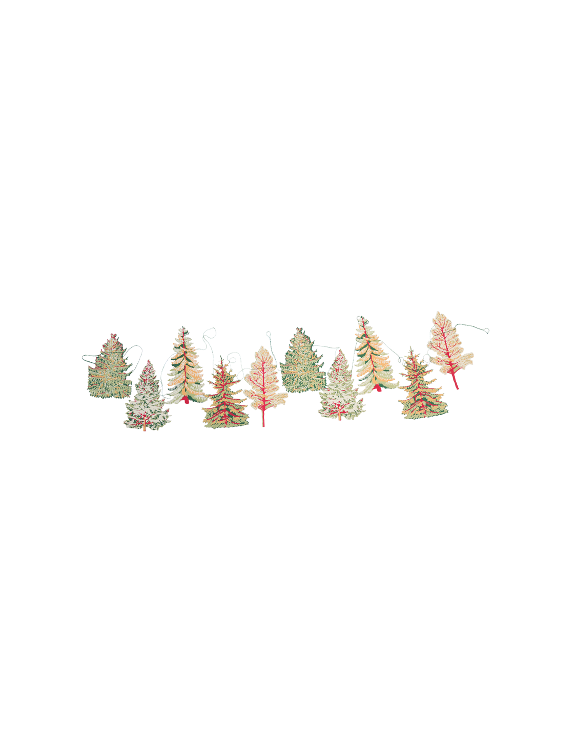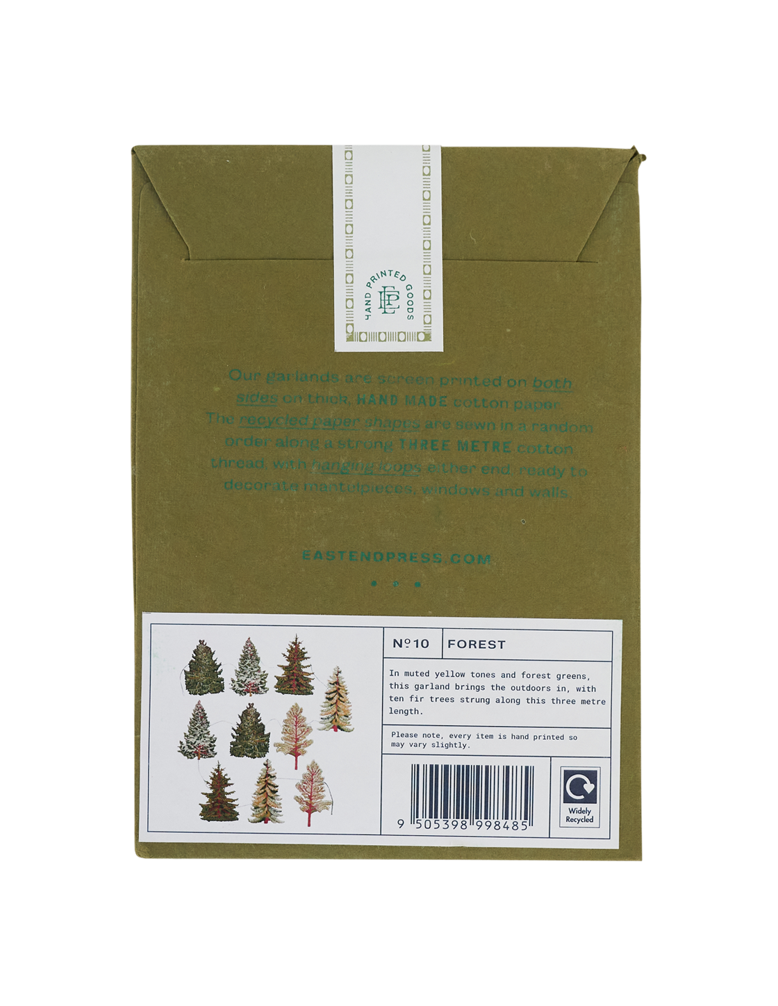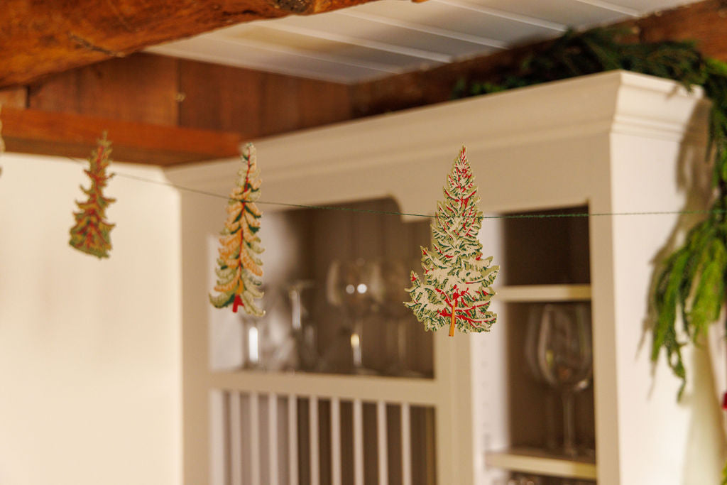 In muted yellow tones and forest greens, this garland brings the outdoors in. It features ten double-sided, hand-printed fir trees elegantly strung along a ten-foot long string.