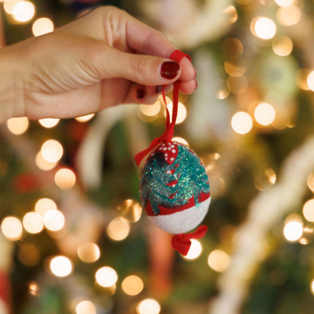 These delicately painted egg ornaments feature festive glitter and bright colors. Hand painted in Salzburg, Austria, they bring a whole new world to your holiday tree.