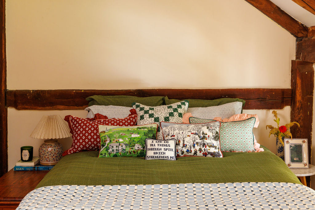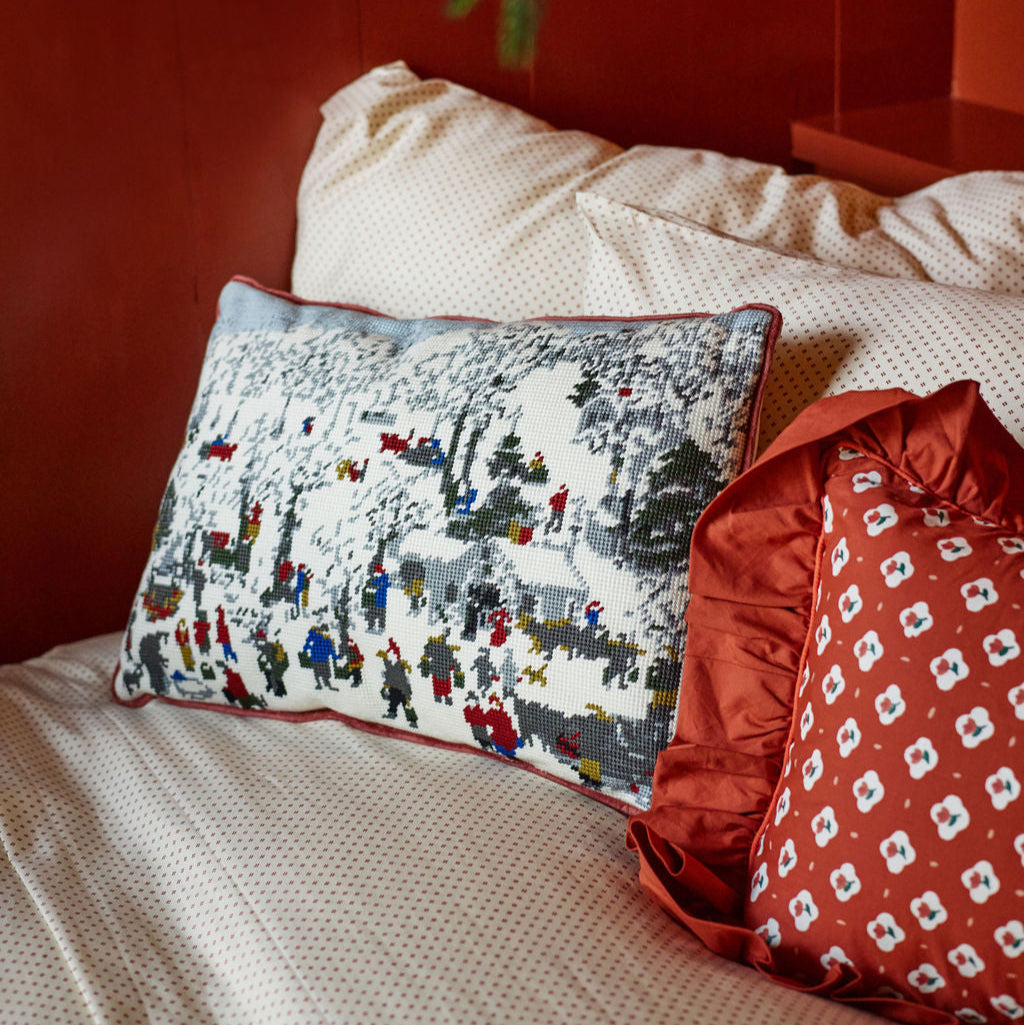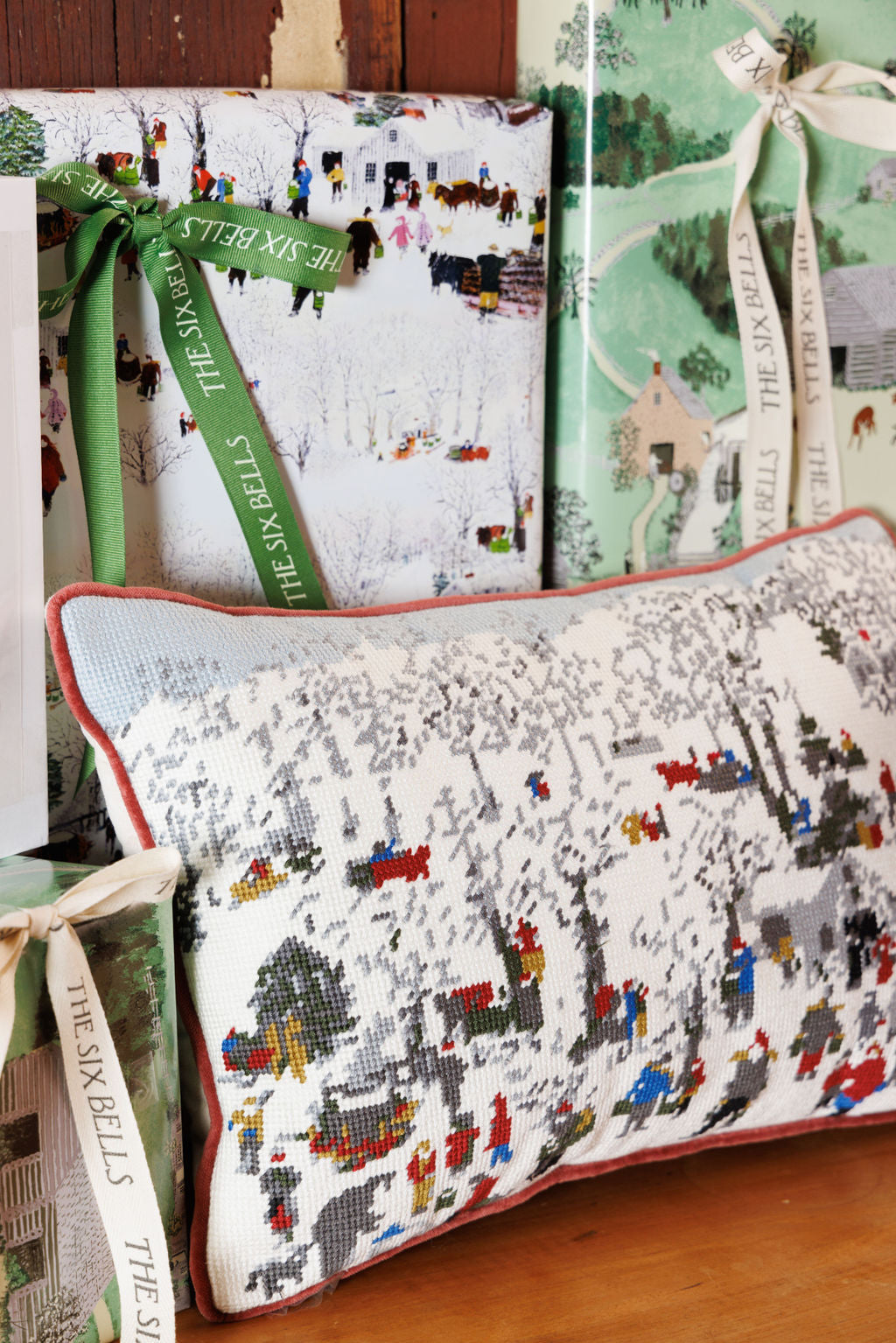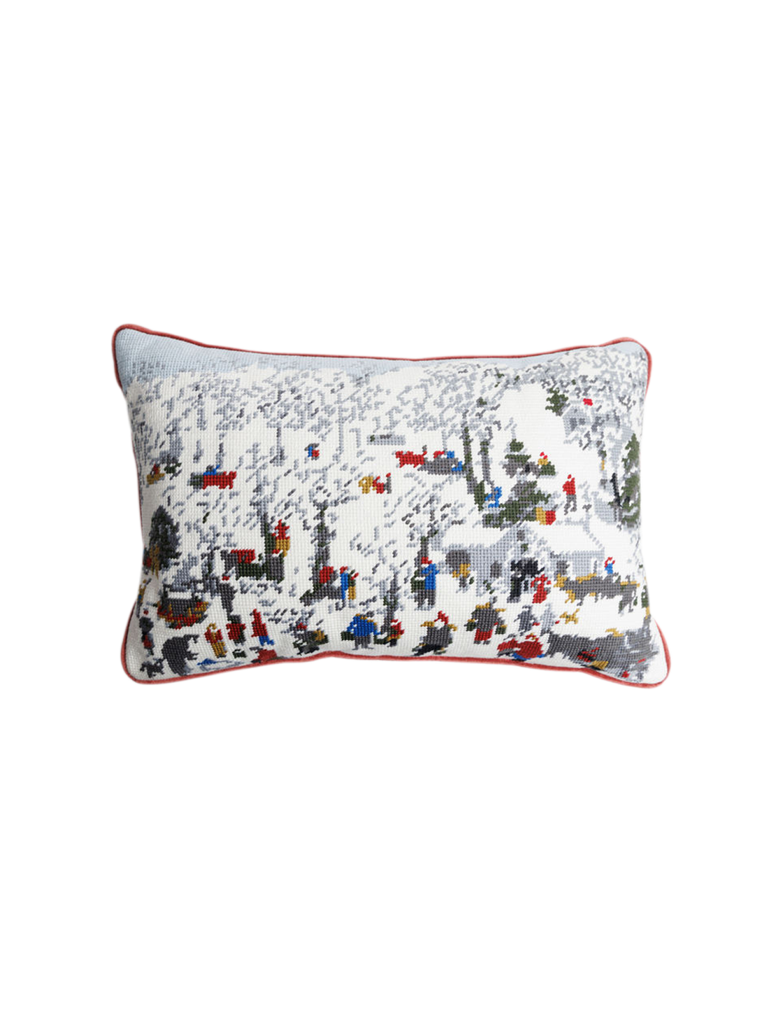 This pillow features Grandma Moses' cozy, wintery scene of Sugaring Off, bringing snowy landscapes and the warmth of maple sugaring to your living space. Hand-stitched with intricate detail, this pillow adds a touch of nostalgia and comfort to any room.