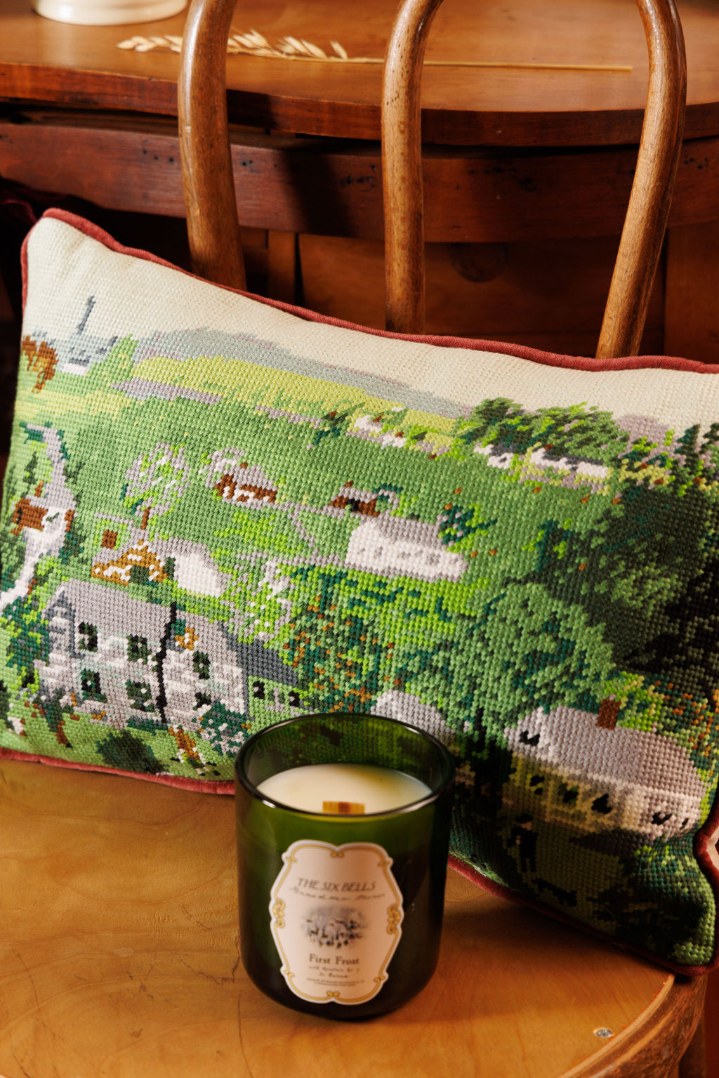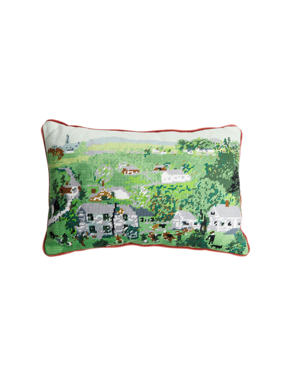 This pillow features Grandma Moses’ Summer Party, a lively pastoral scene filled with the vibrant colors and joy of summer gatherings. Hand-stitched with intricate detail, this pillow adds a touch of nostalgia and comfort to any room.