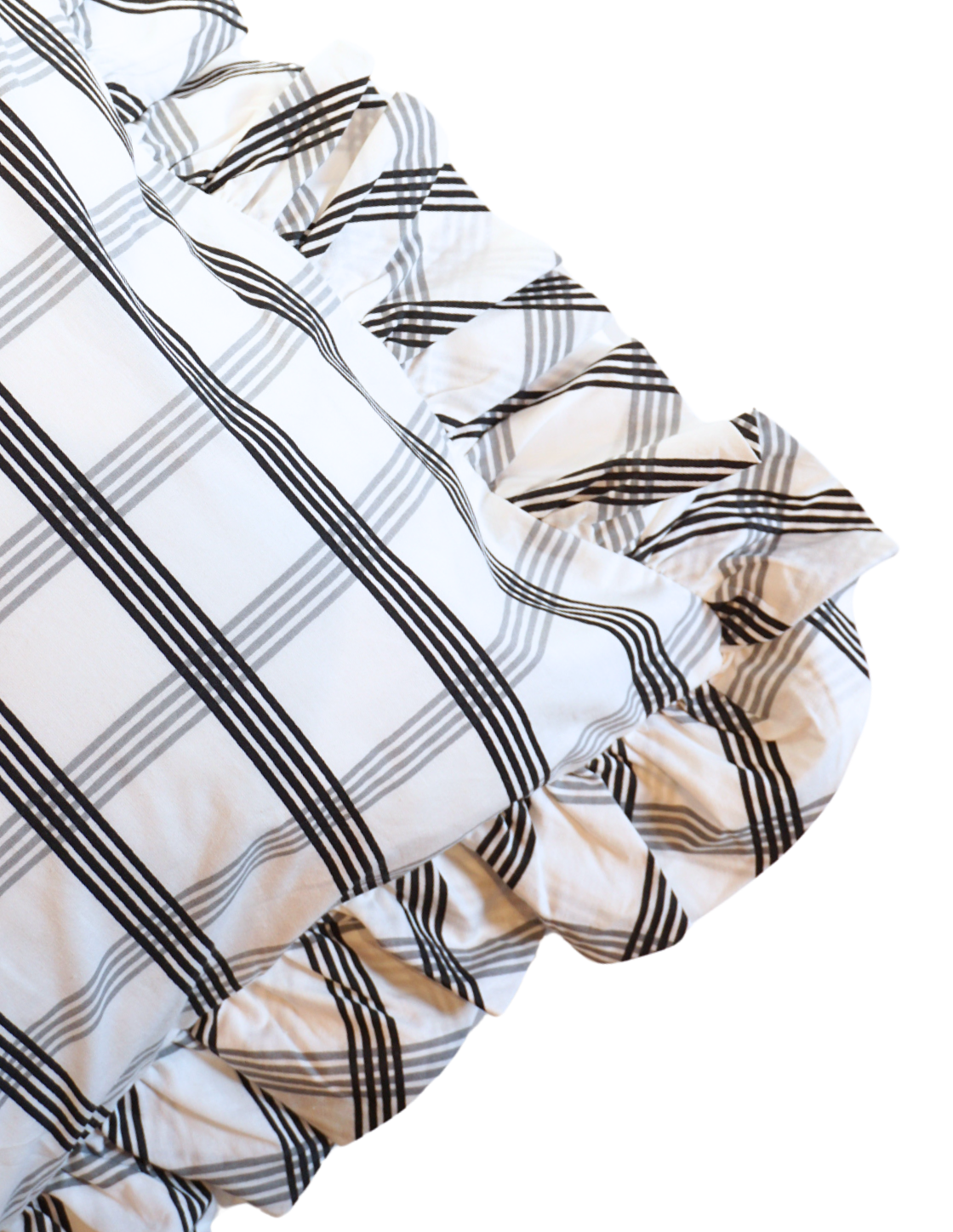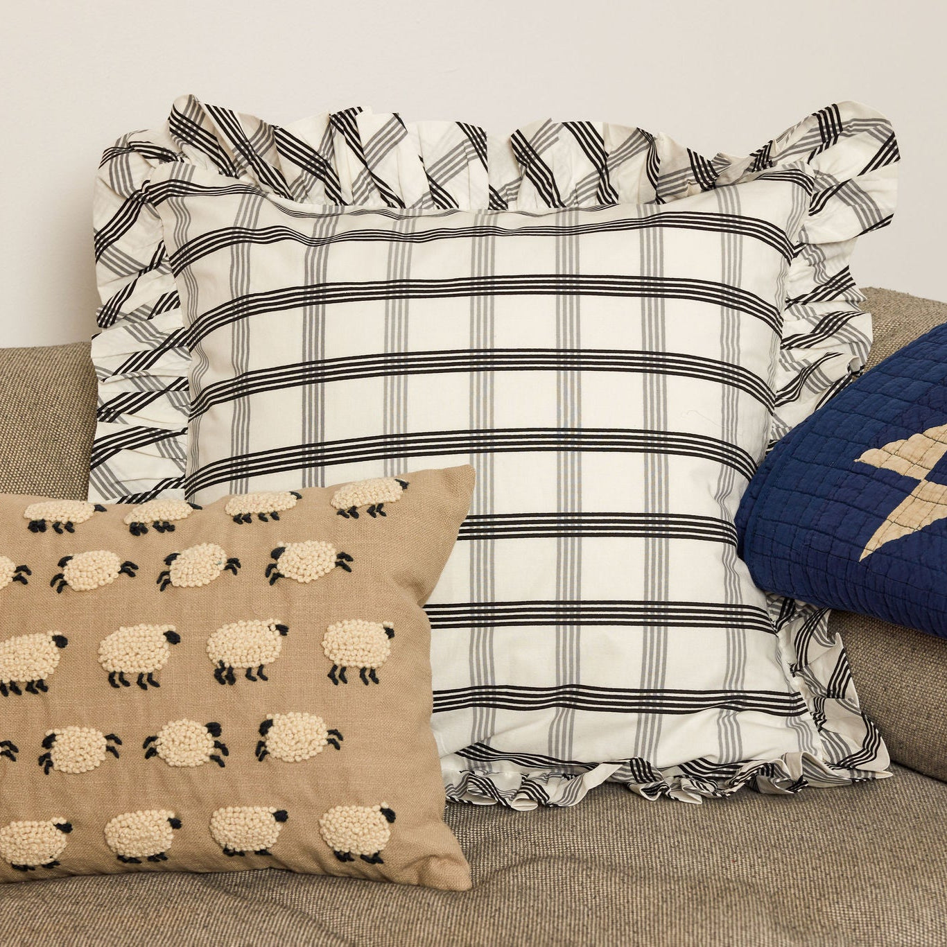 A cozy pillow featuring a plaid pattern and a charming ruffled border. It's the perfect neutral accent with a touch of classic charm for your living room, bedroom, or favorite reading nook.