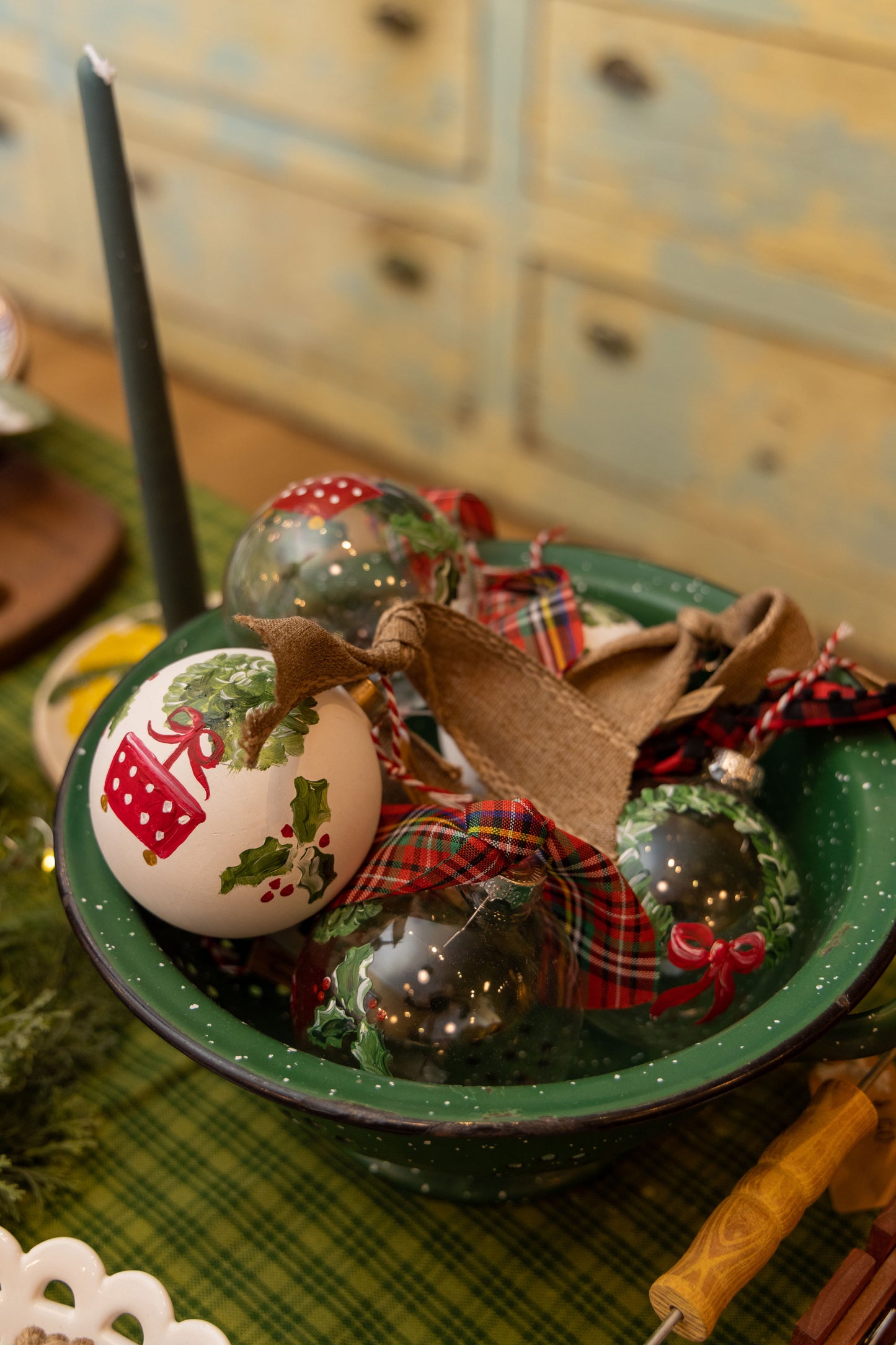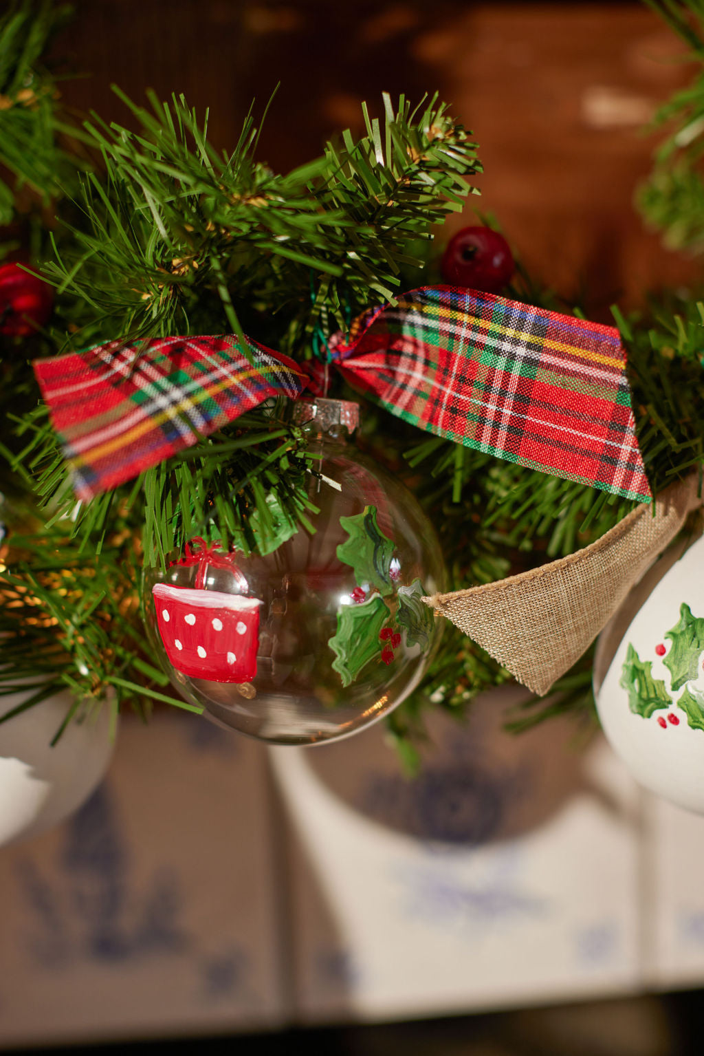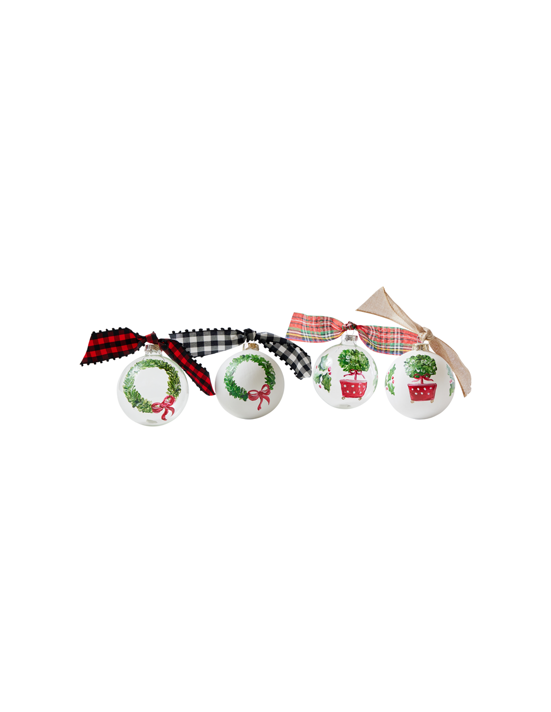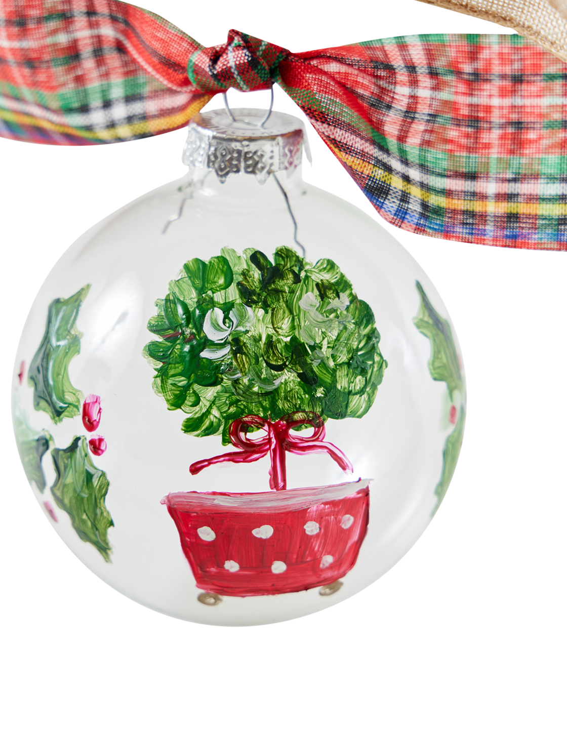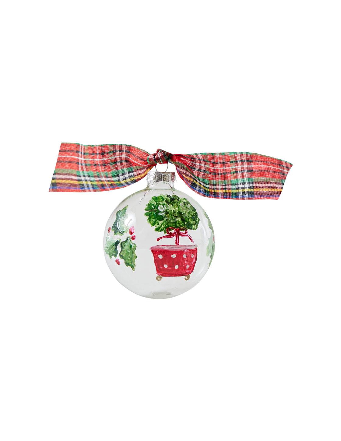 Hand painted clear glass ornament with Christmas greens and a smart plaid ribbon. Collect with the Painted Wreath ornaments to gift or build a unique set.
