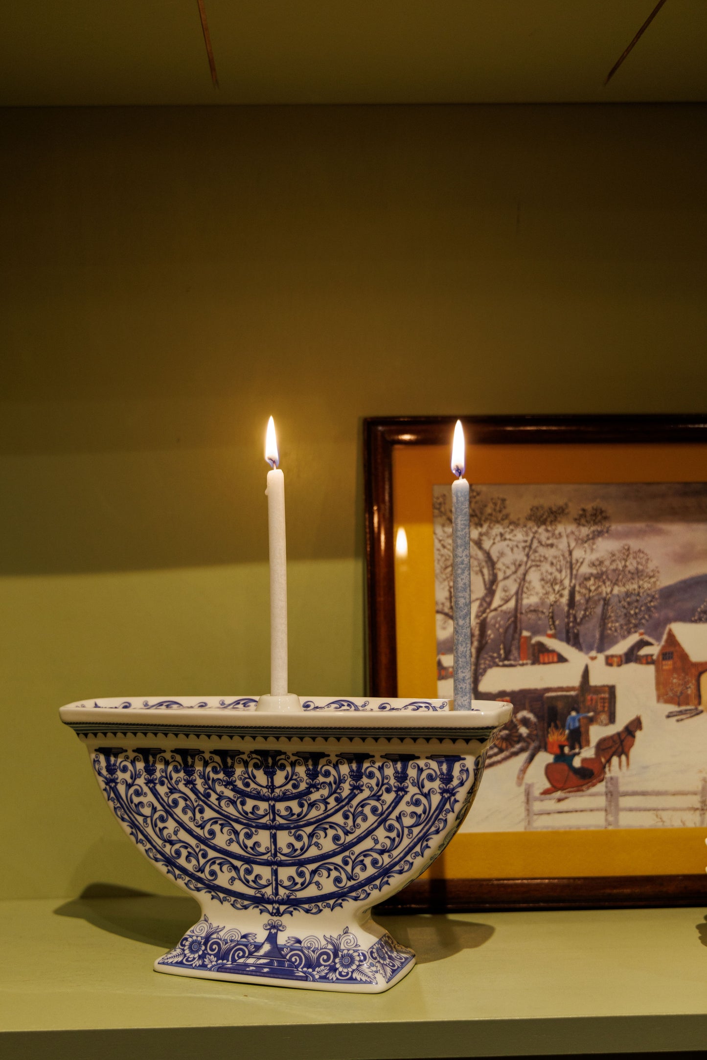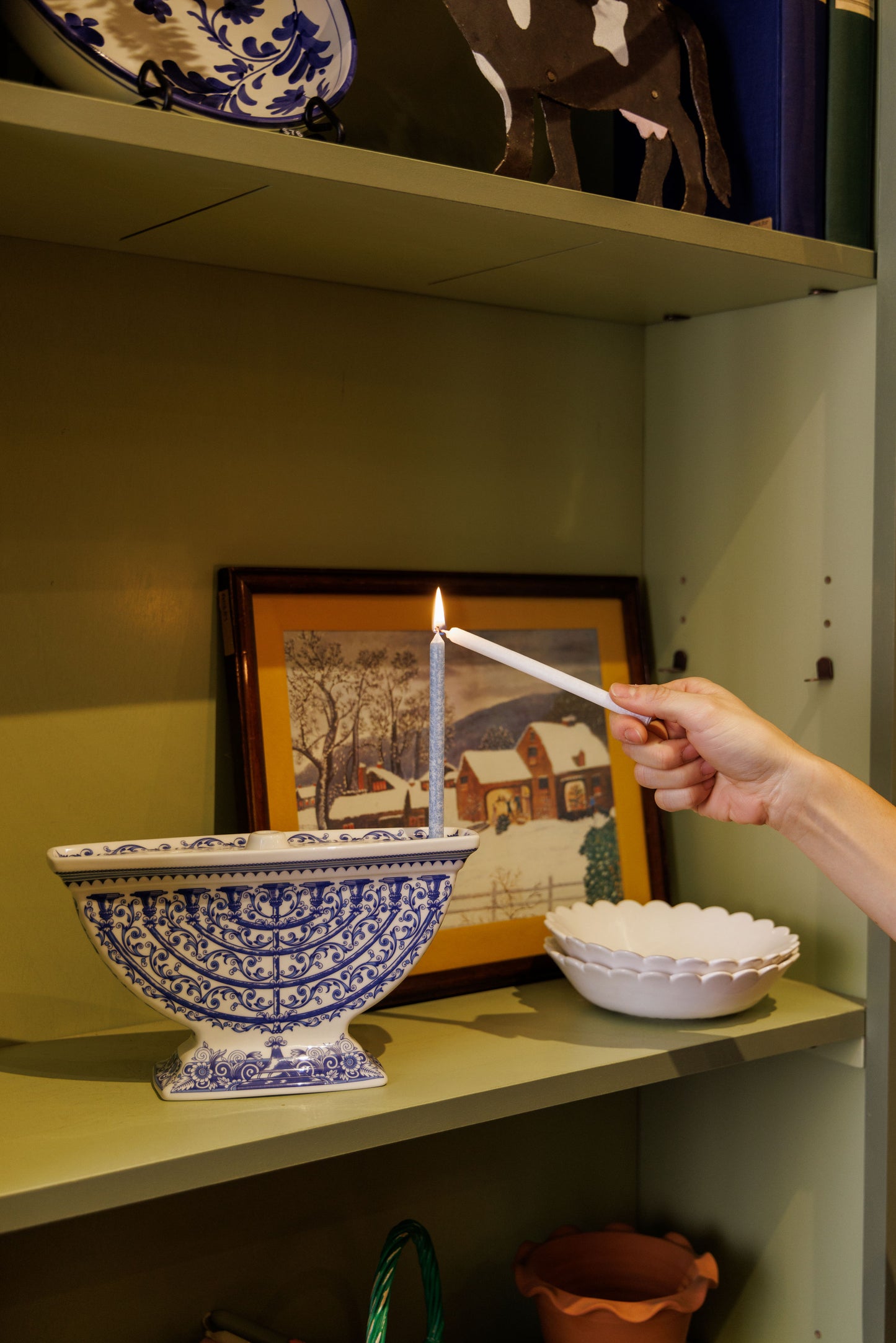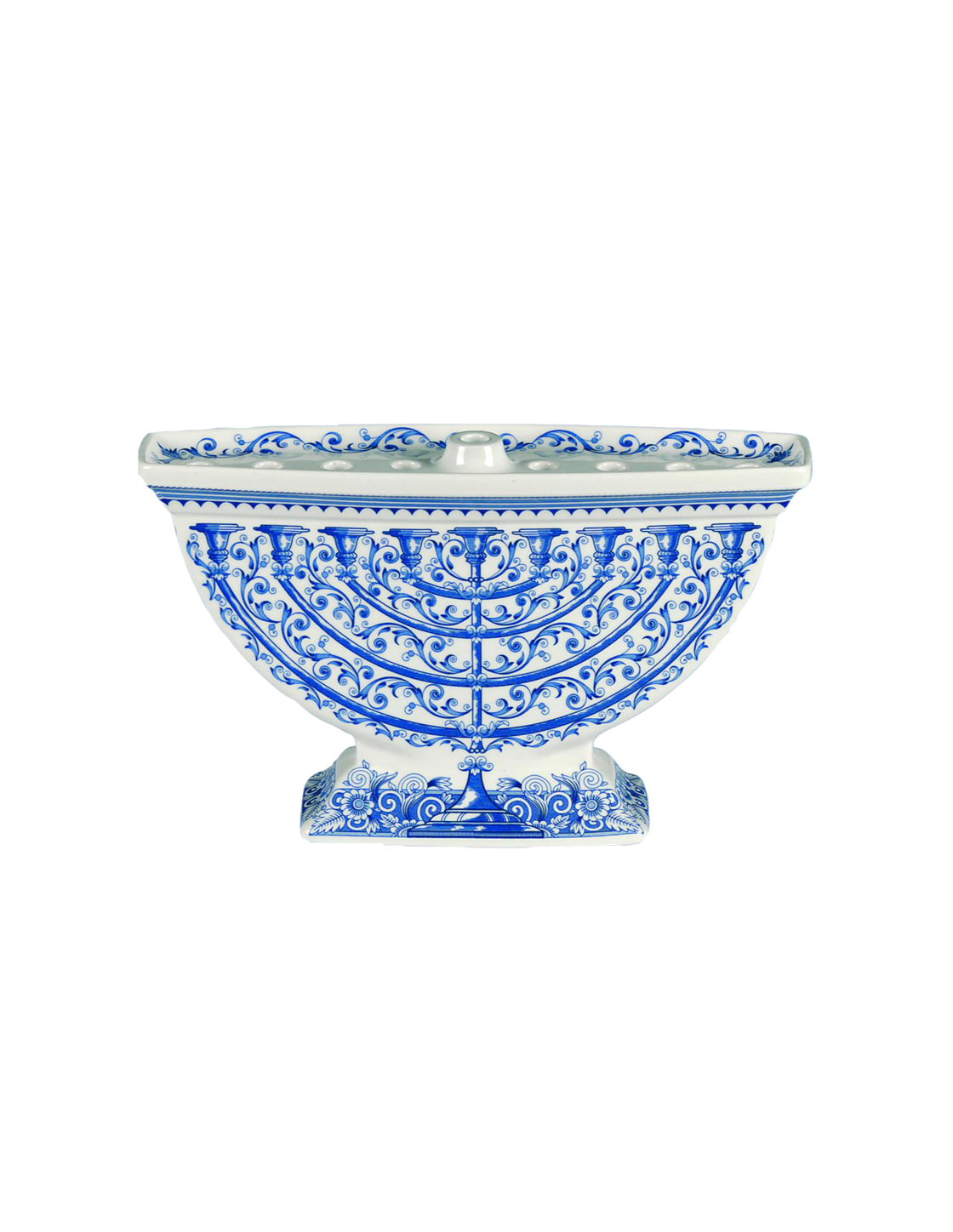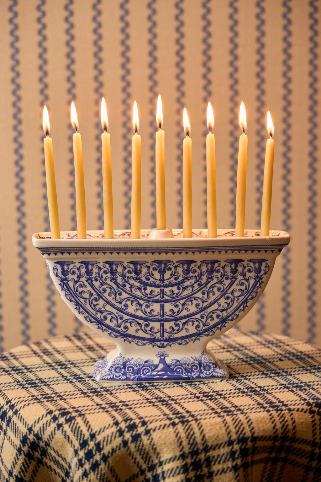 Eight cozy nights! Fine porcelain trompe l'oeil menorah with blue and white Judaica-inspired design. Pair with our Hanukkah Beeswax Taper Candles.