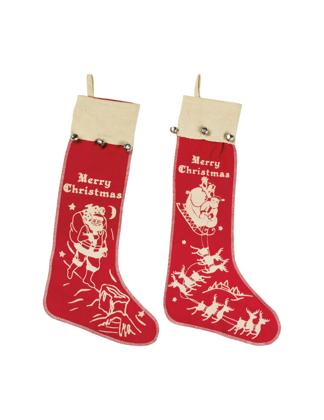 A set of two large felt stockings, featuring "Merry Christmas" sentiments, different Santa and reindeer illustrations, and charming bell trims. Each one features a top fabric loop for easy hanging.