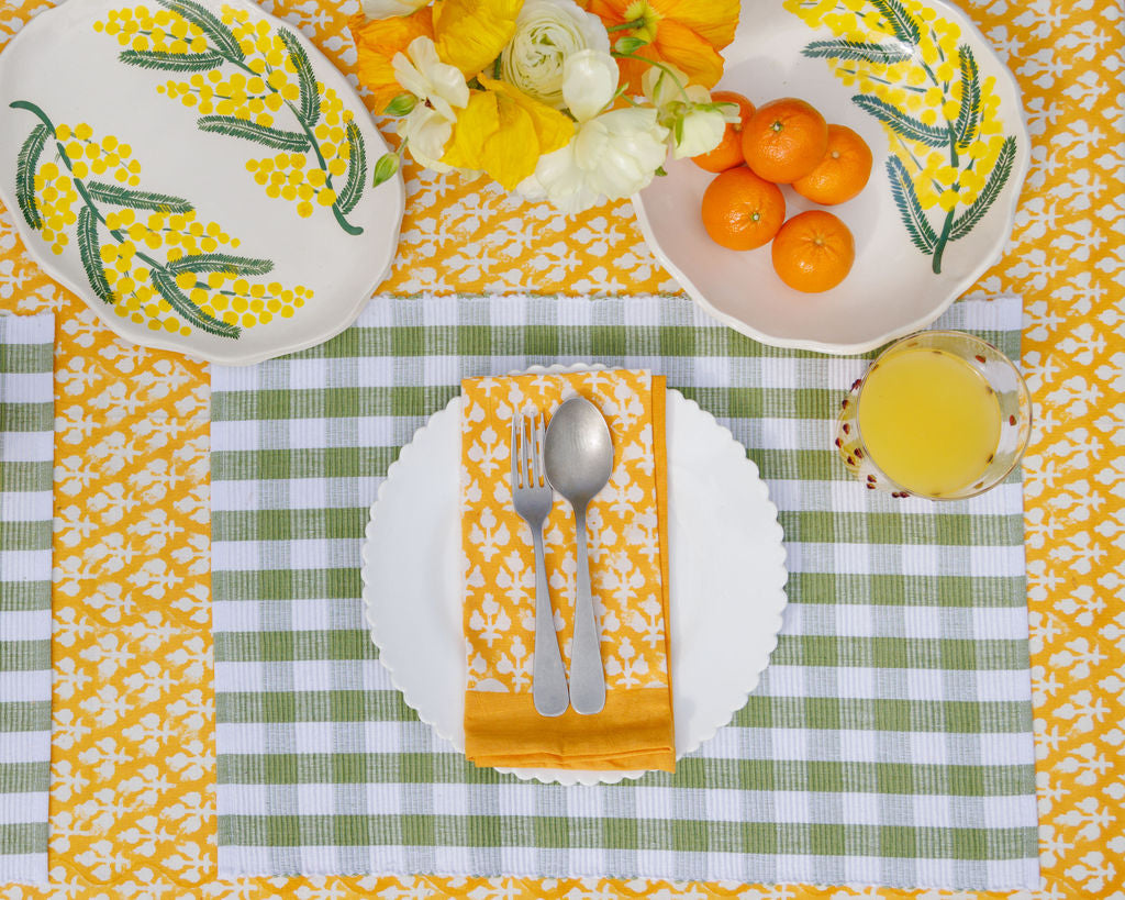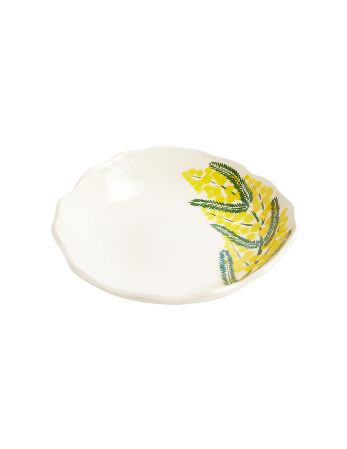 Sunny yellow mimosa flowers brighten this handmade ceramic bowl, finished with a clear glaze designed to crackle as it ages. Mimosa flowers are often used to honor women in particular.