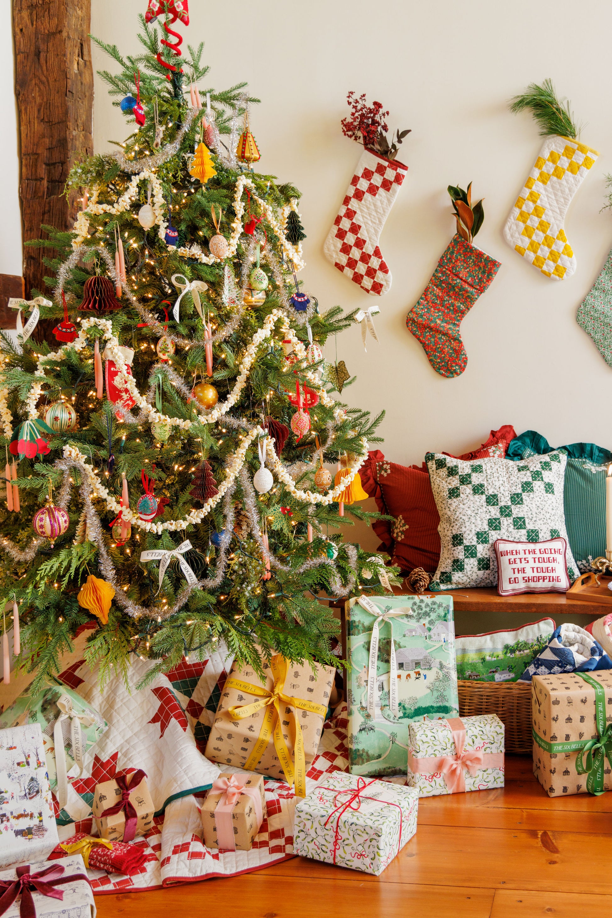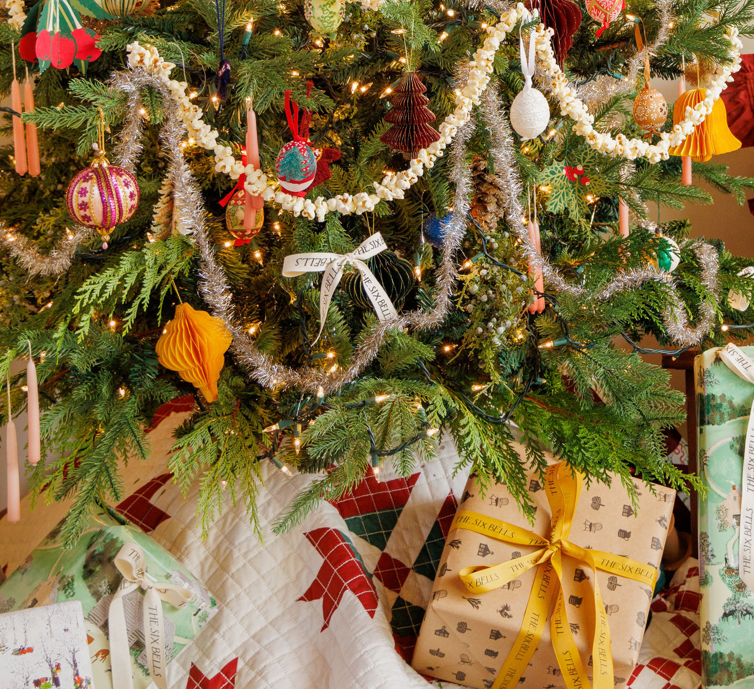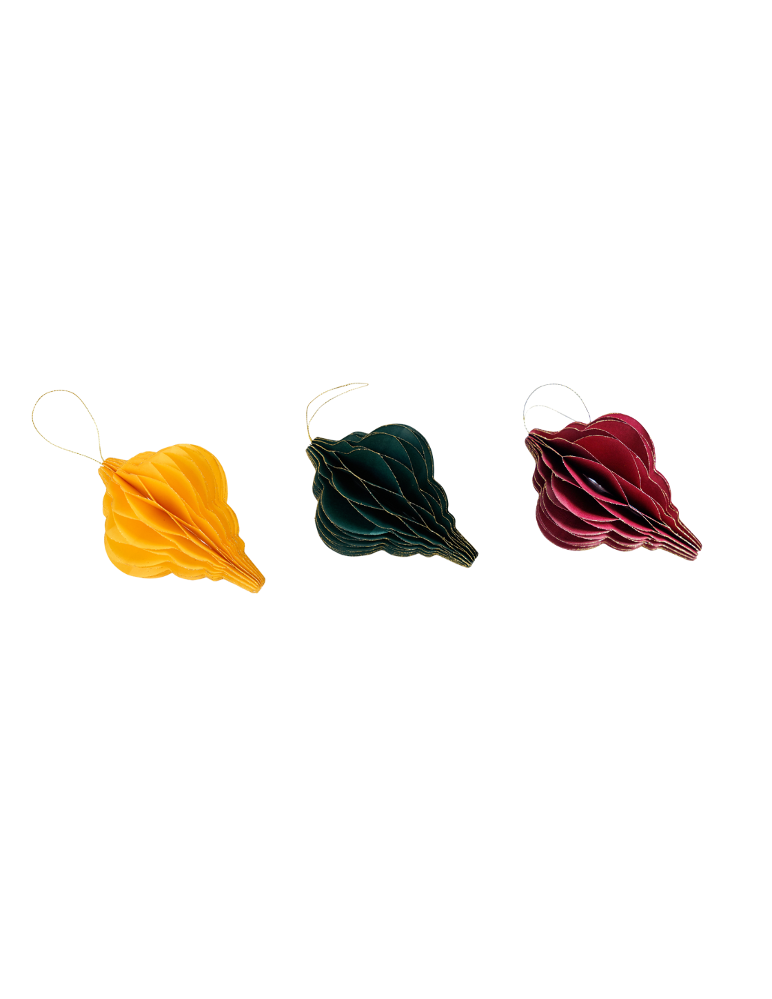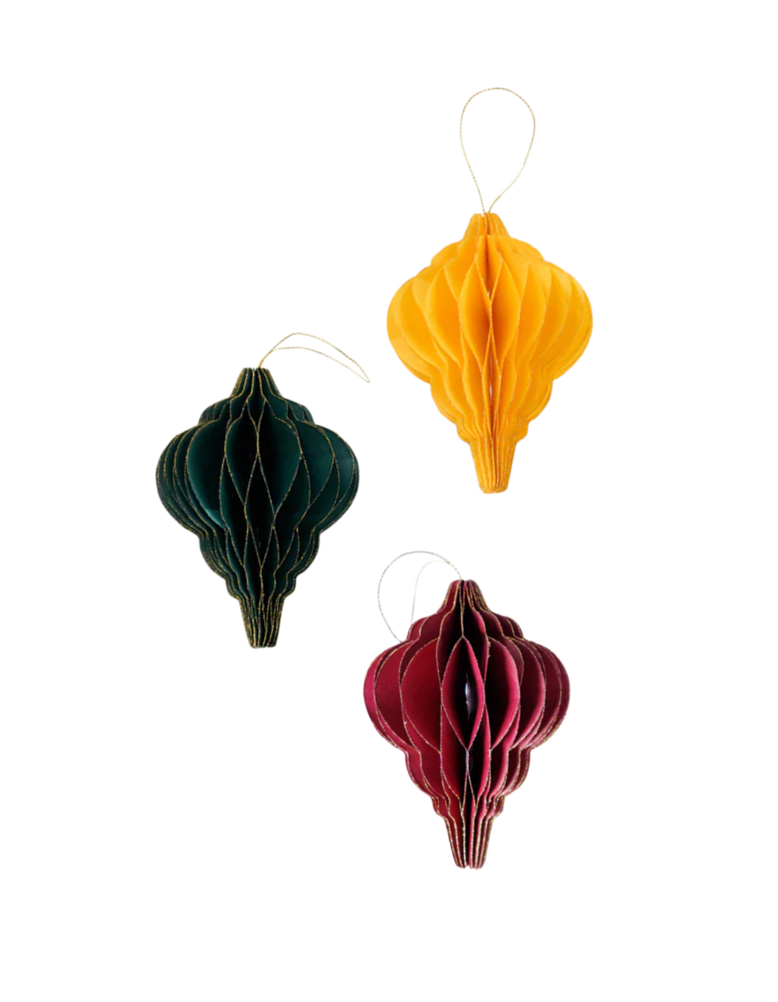 A trio of lantern-shaped paper ornaments in mustard, red, and green - features a magnetic closure for easy storage and a touch of glitter.