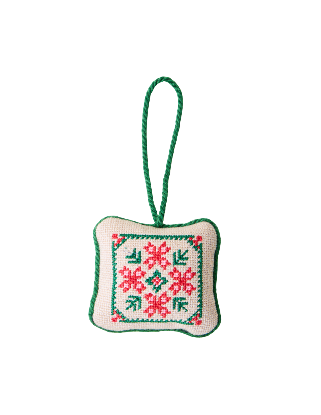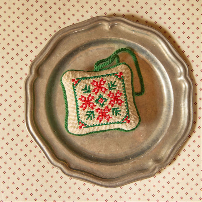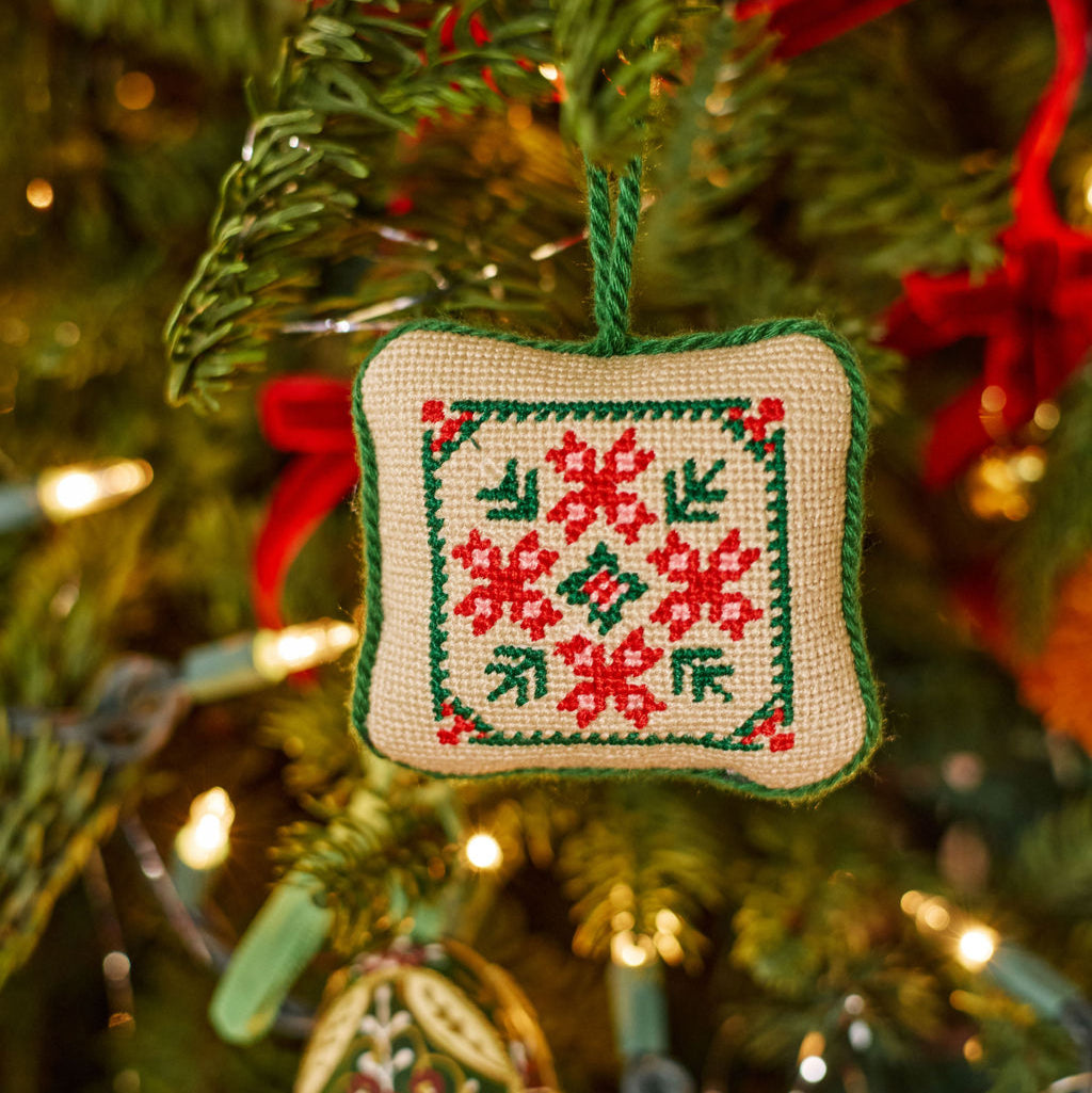 Featuring the flower of the season, this sweet ornament stitches warmth and holiday spirit into your tree.