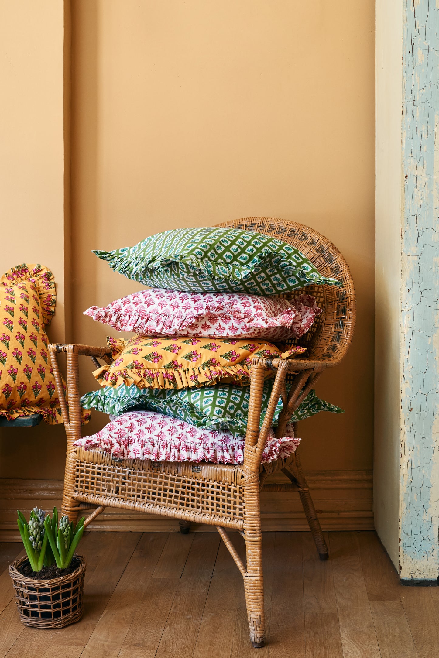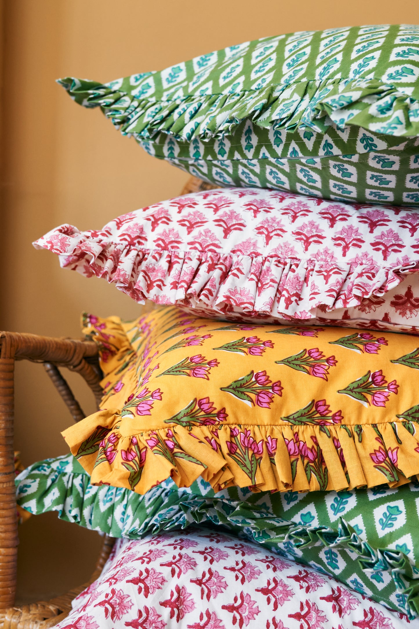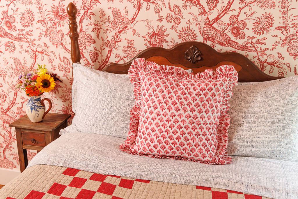 A red and white pillow with a block-printed floral design and a sweet ruffled border.