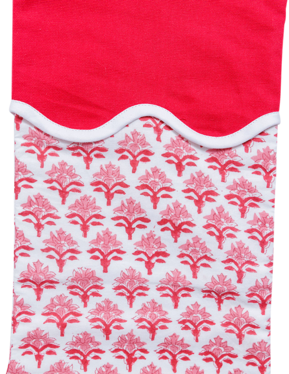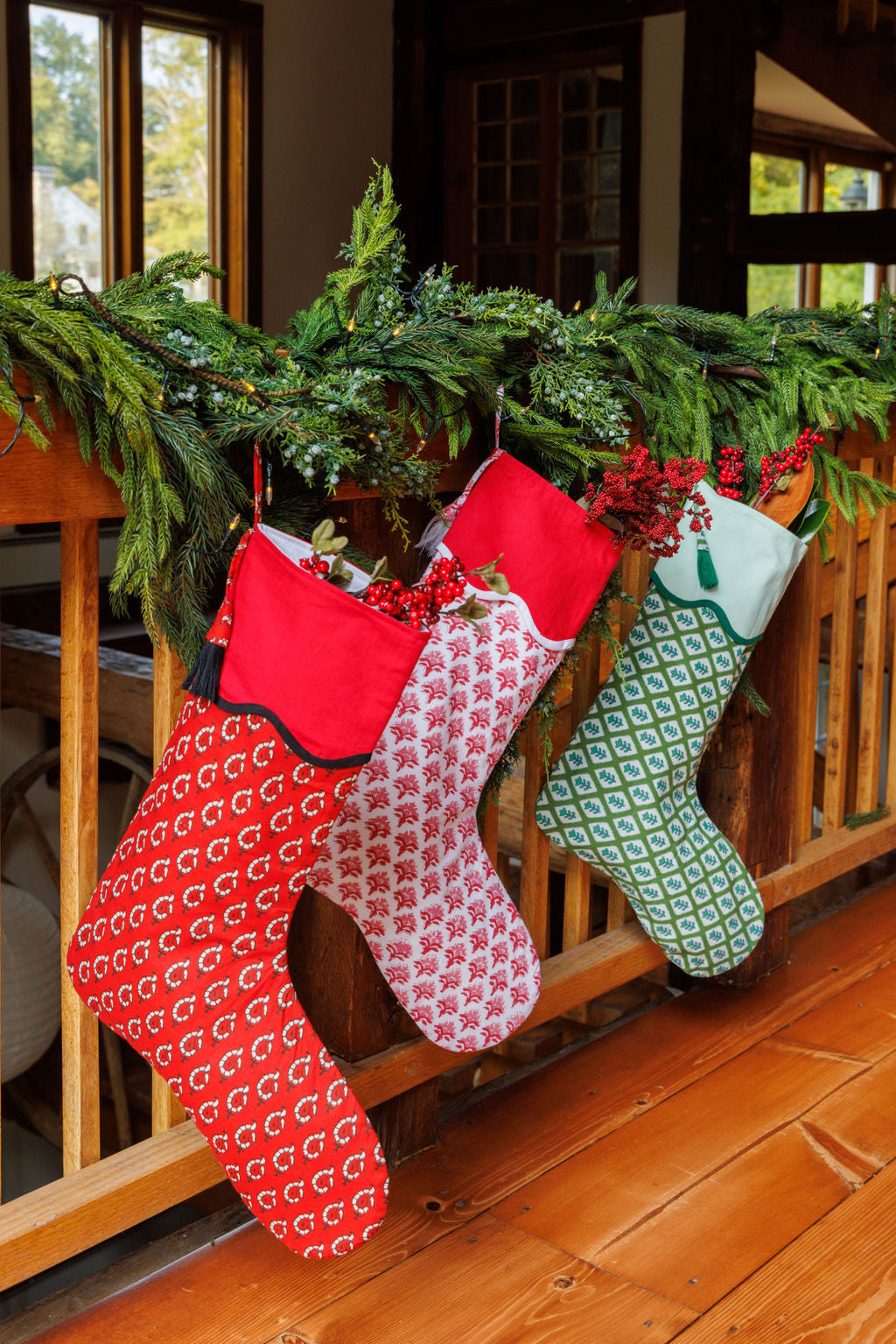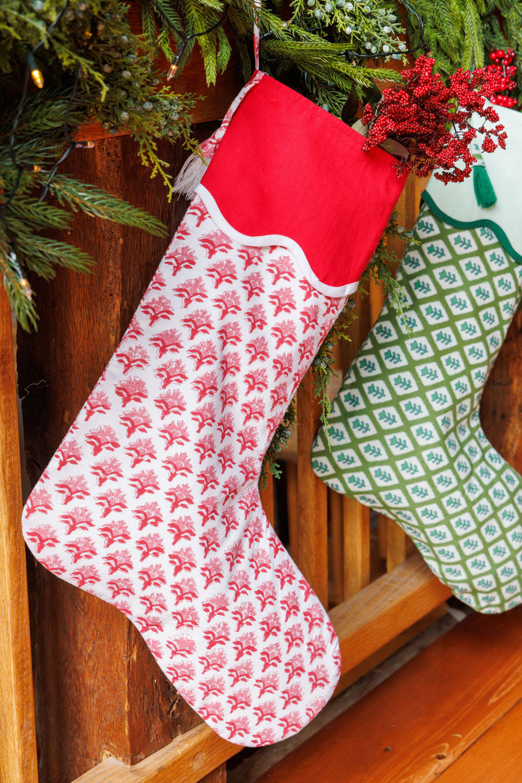 This stocking features a red and white block-printed floral design and a sweet scalloped cuff - perfect for adding holiday spirit to your mantel or shelves! (and we love to leave them up through the New Year!)