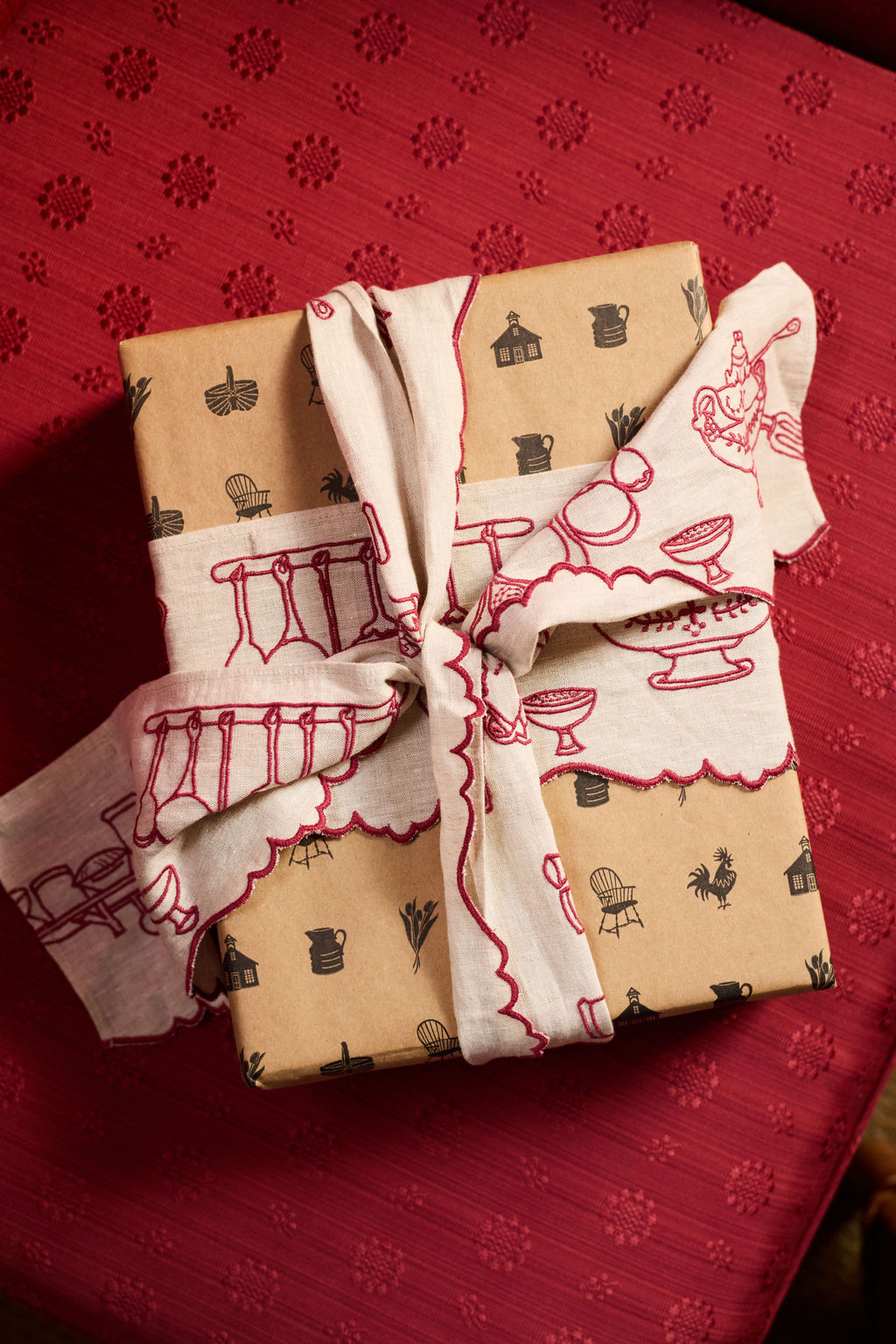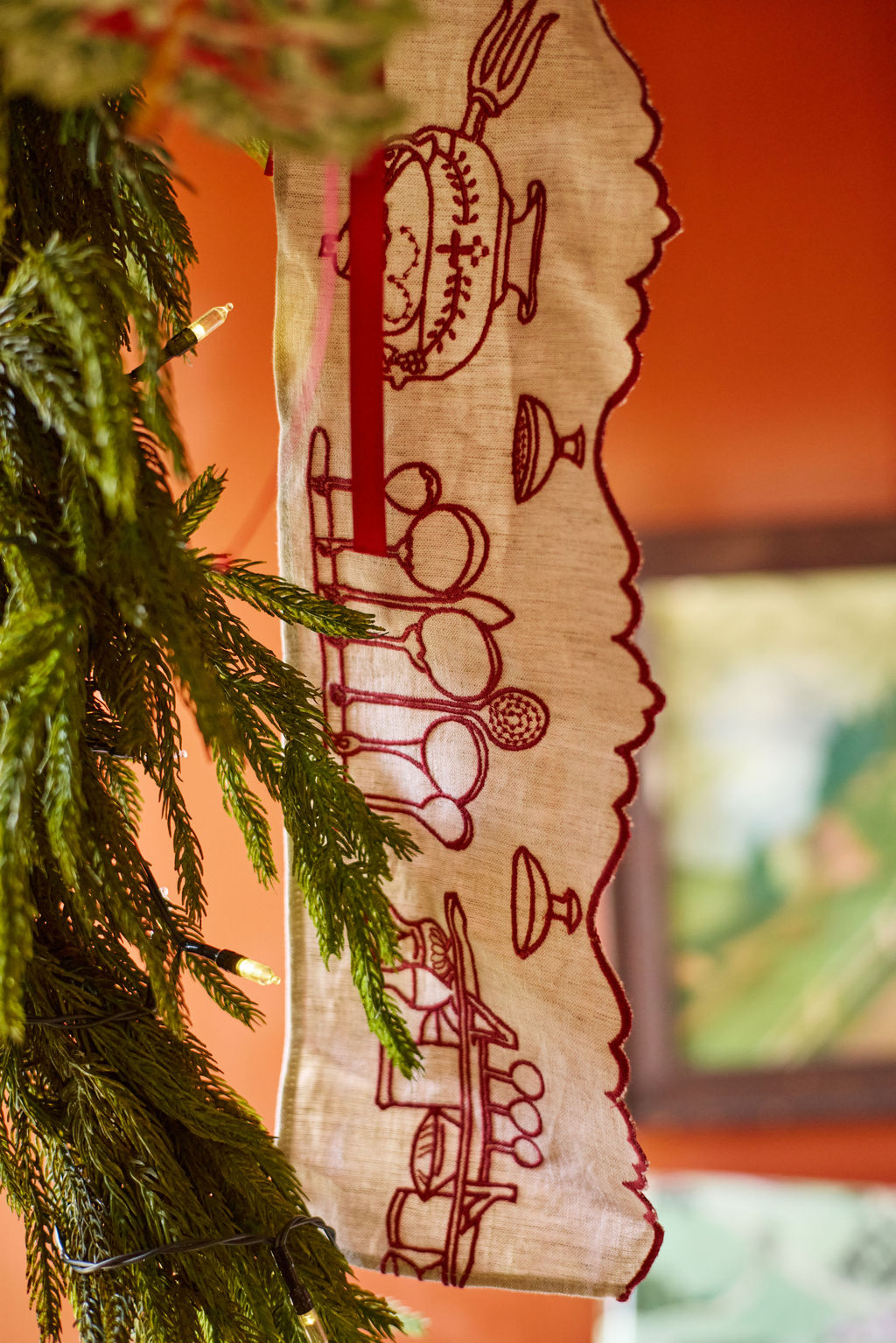 Add a nostalgic touch to your home with this charming banner. Crafted from 100% linen, it features delicate redwork embroidery of pots, pans, vases, goblets, canisters, and more. Thoughtfully designed with loops for easy hanging, it's a warm and whimsical accent for any mantle, wall, or shelf.