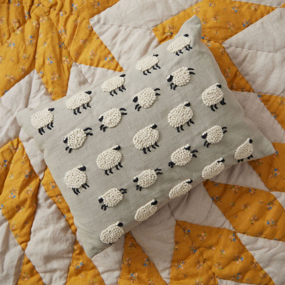 Imagine drifting off to dreamland in a tranquil countryside, counting sheep as they graze in a lush meadow. This charming handmade pillow brings that idyllic scene to life with dozens of beautifully embroidered sheep on soft cotton.