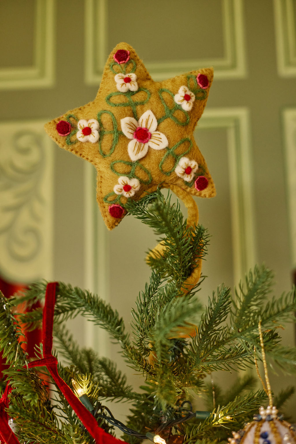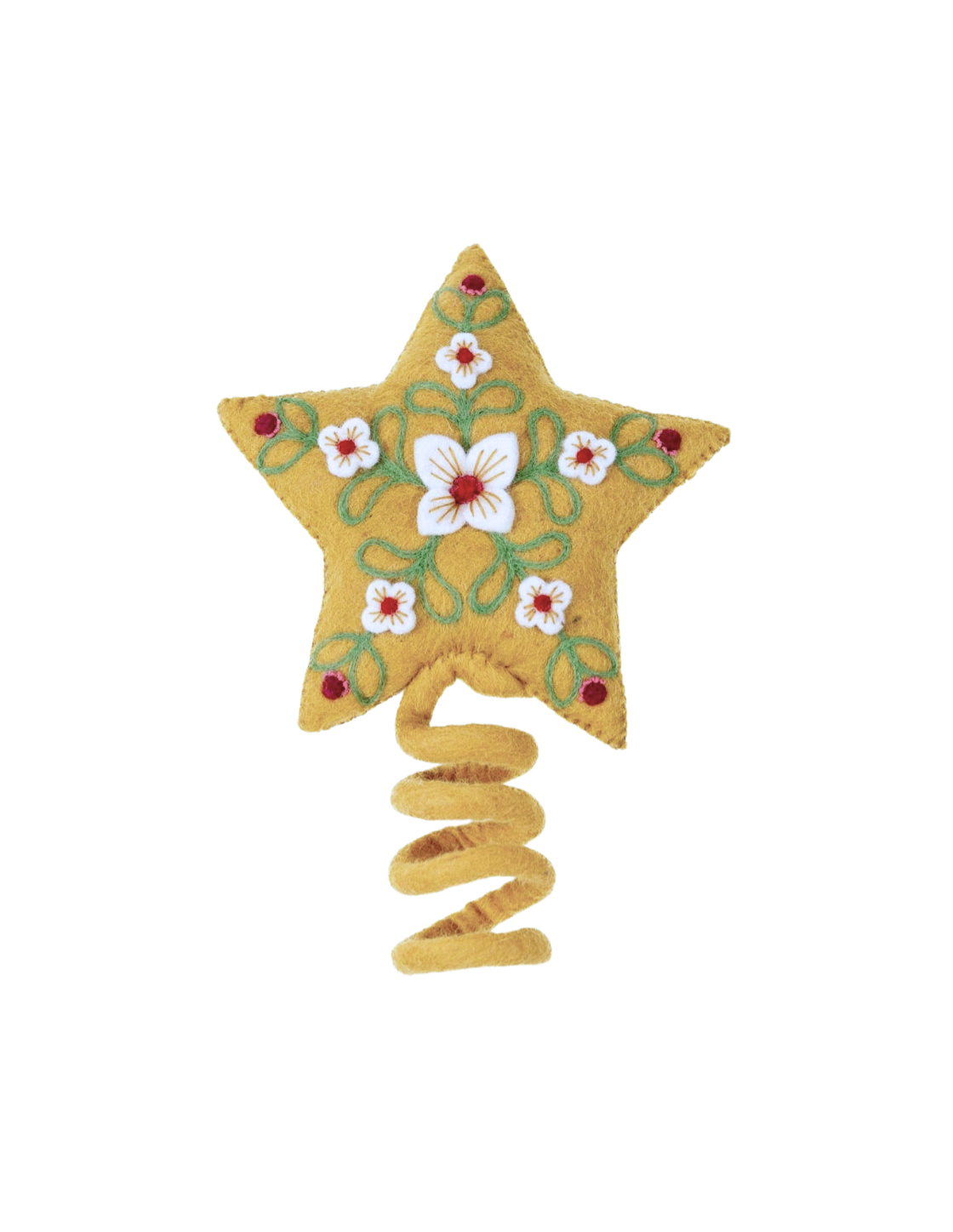 Add a whimsical touch to your holiday decor with this felt tree topper, featuring delicate hand-embroidery and beautifully cut felt flowers.