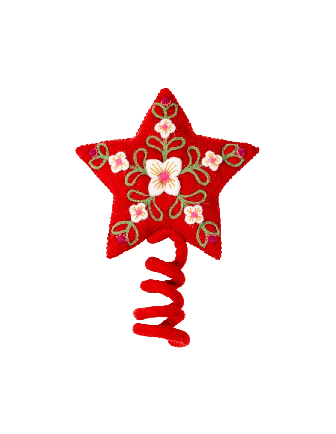 Add a whimsical touch to your holiday decor with this felt tree topper, featuring delicate hand-embroidery and beautifully cut felt flowers.