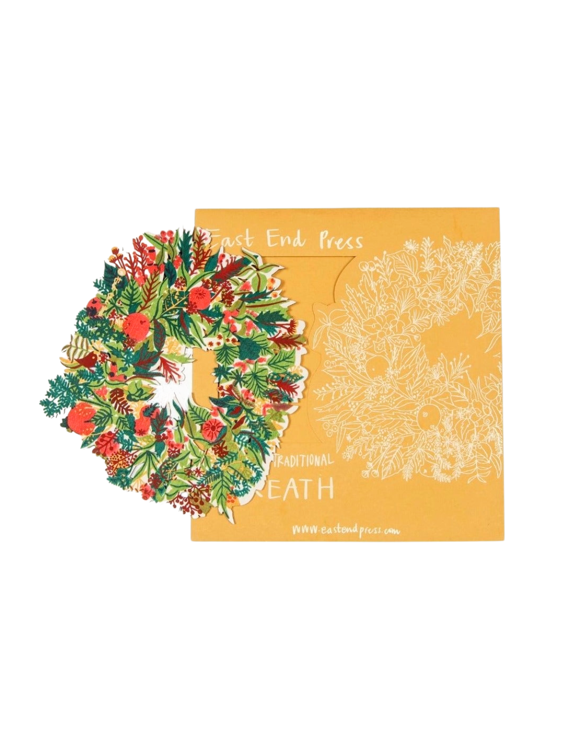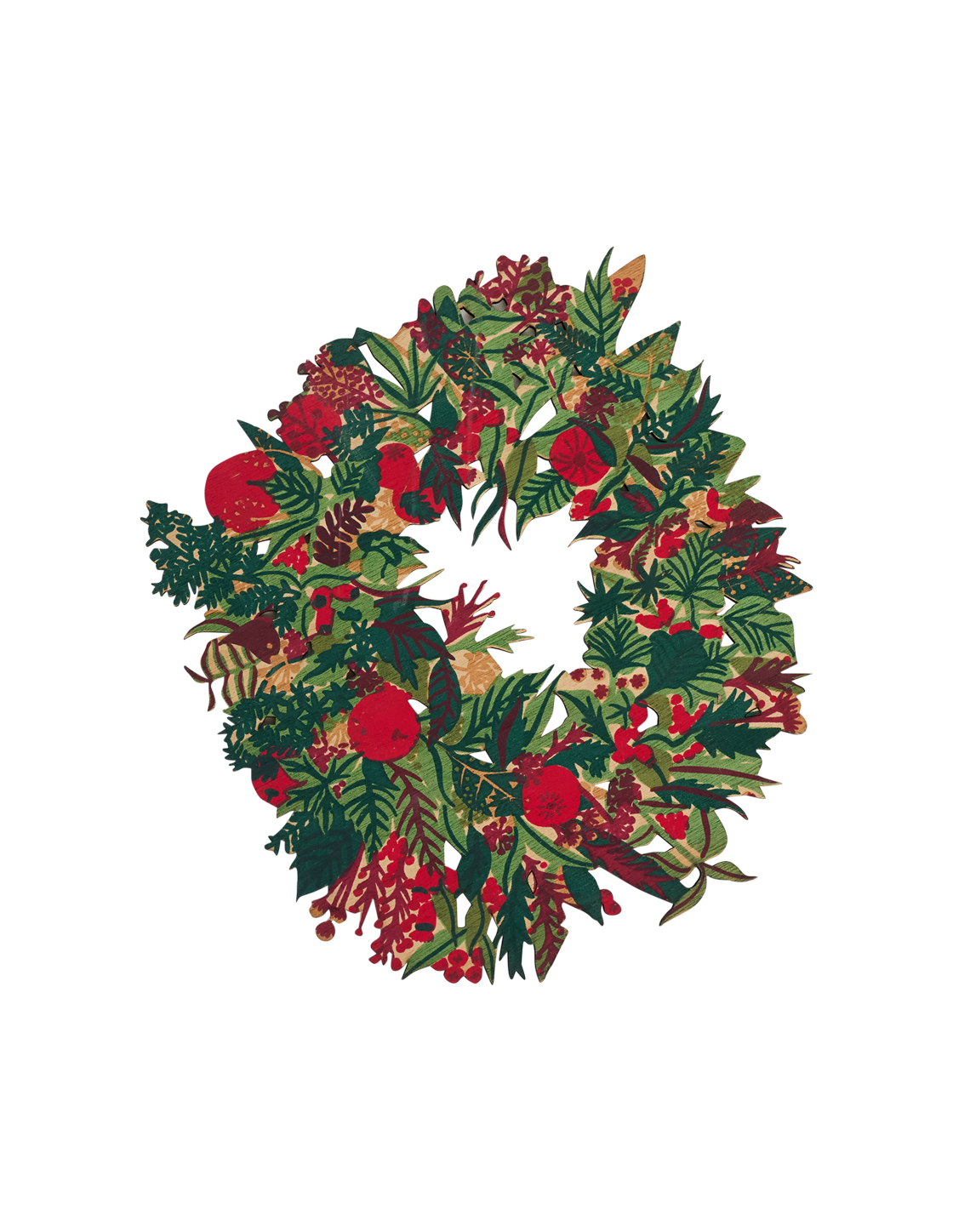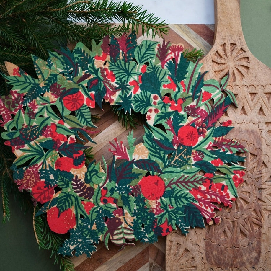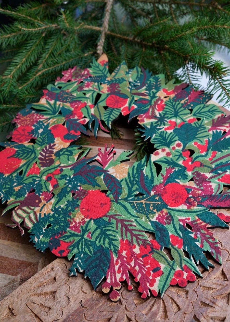 Hand-printed onto sustainably sourced wood, this wreath is green and festive whatever the season! Double sided, and detailed with berries, pine cones and foliage.