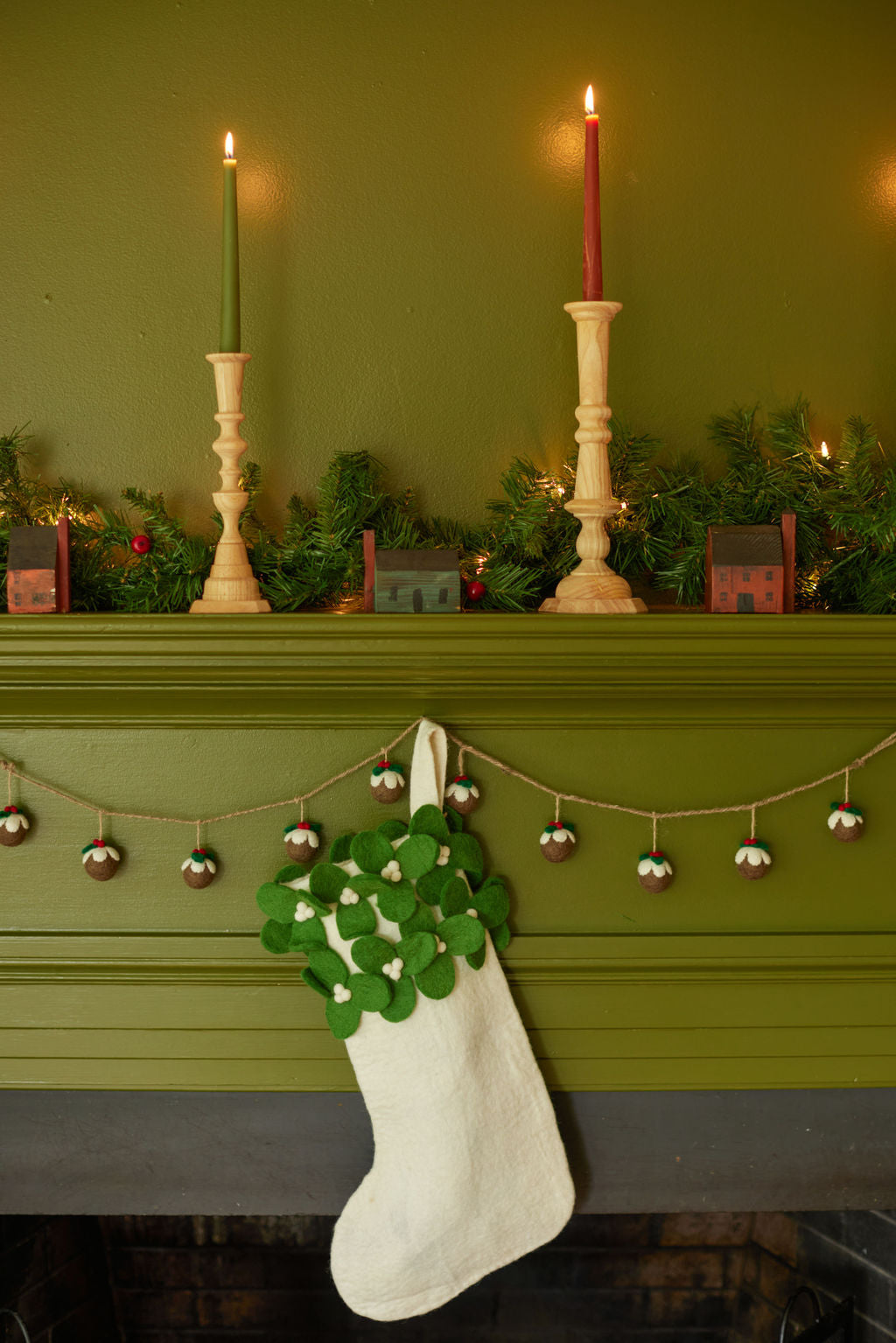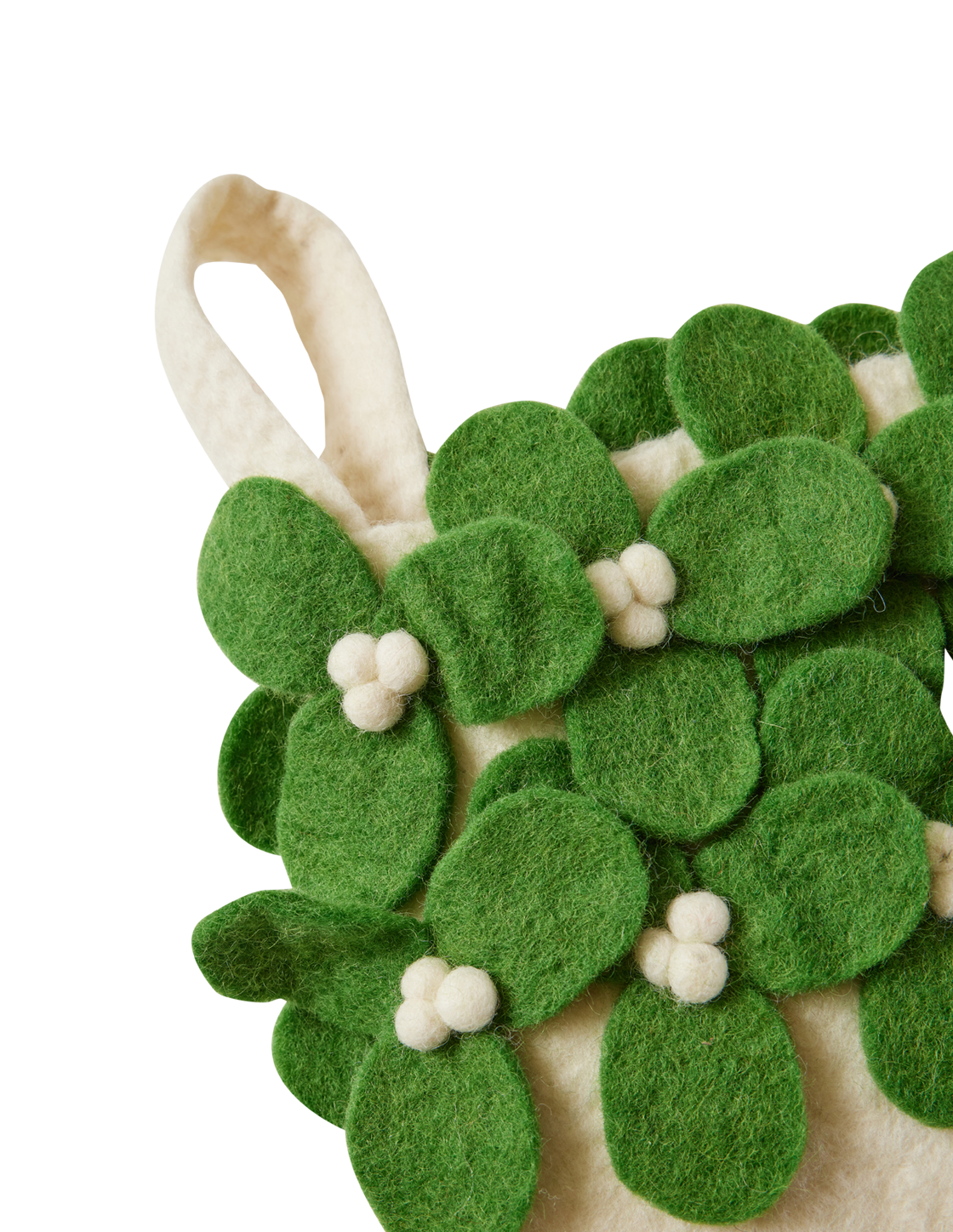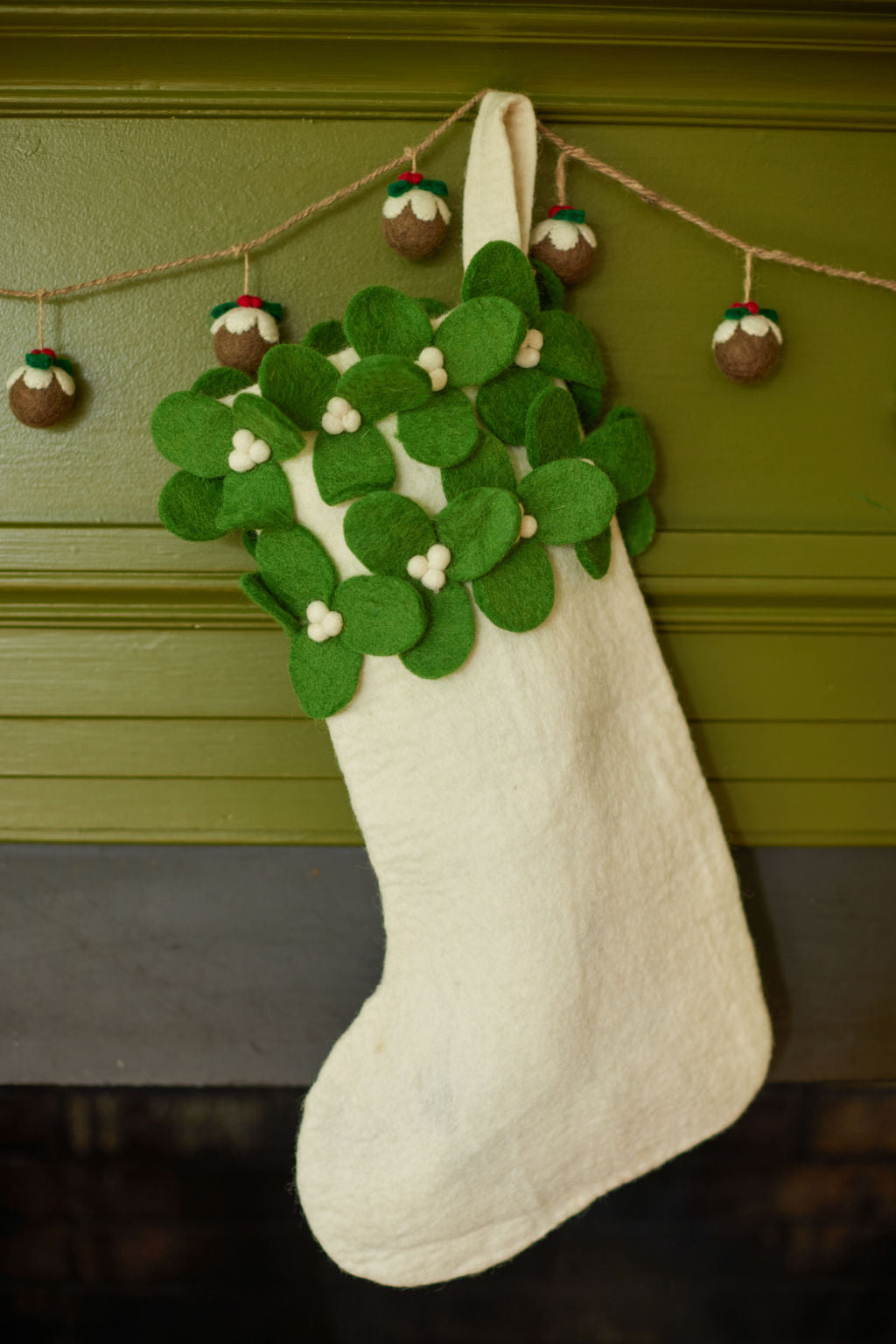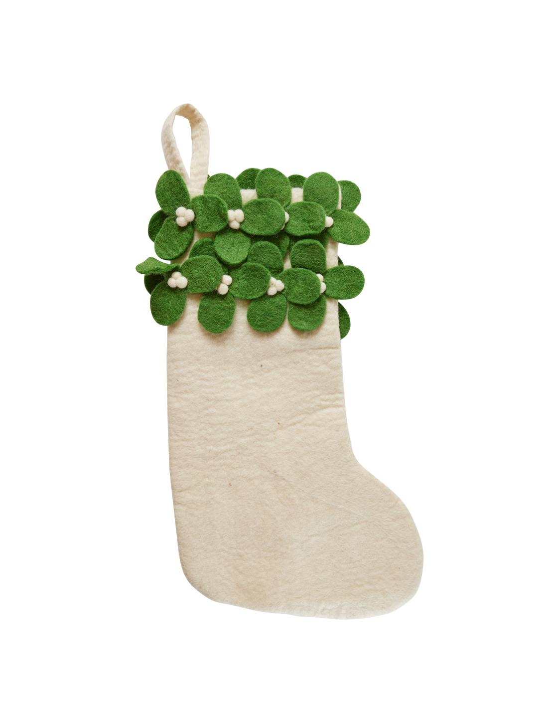 White felt full size stocking with soft mistletoe leaves and white berries.