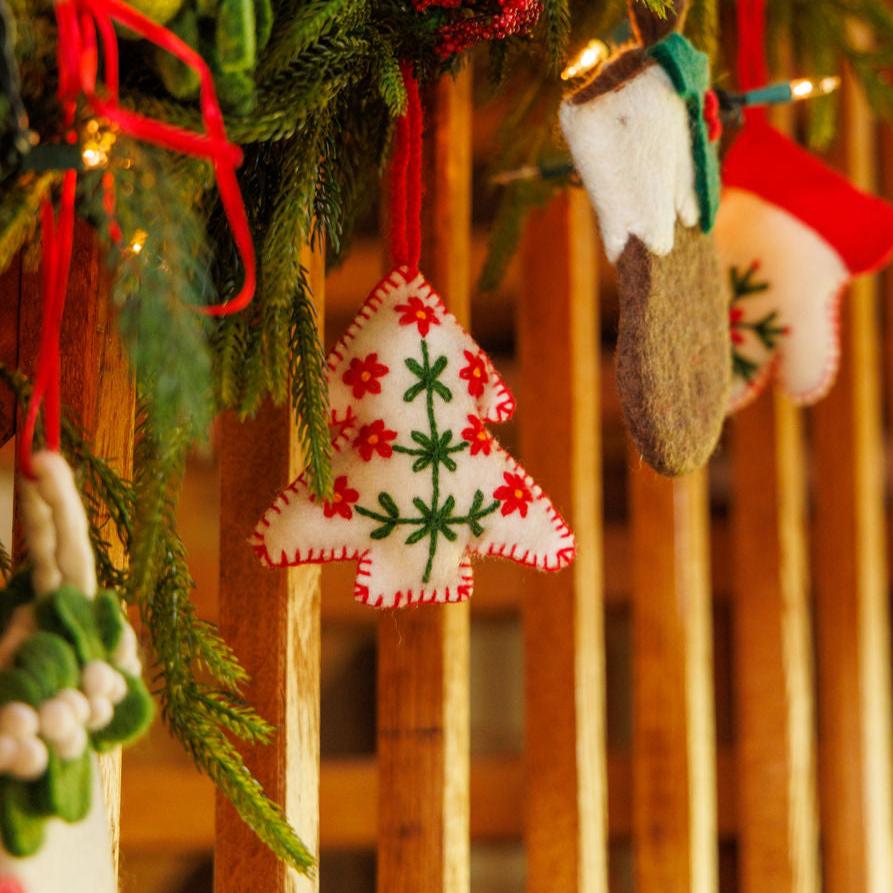 Sweet and soft white wool tree ornament with holiday embroidery.